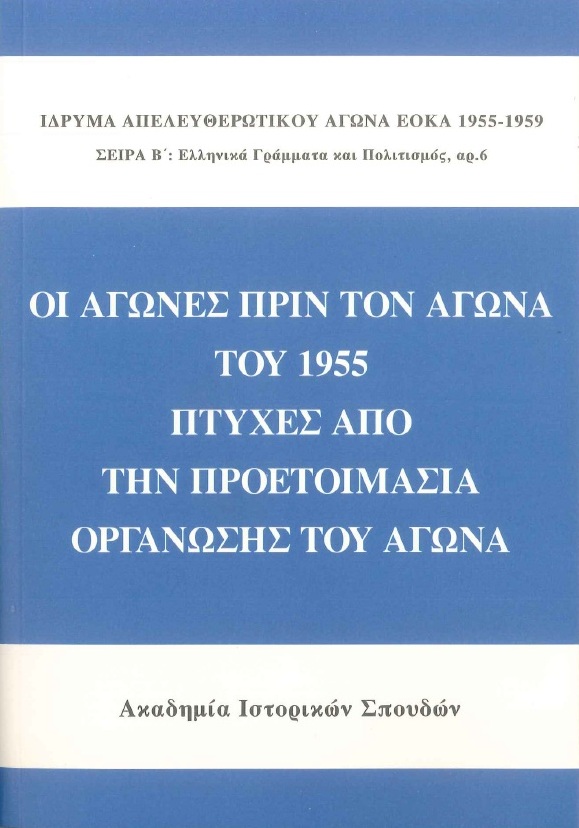Κυκλοφόρησε πριν από μερικές ημέρες ο τόμος του Ιδρύματος Απελευθερωτικού Αγώνα ΕΟΚΑ 1955-1959, Οι αγώνες πριν τον Αγώνα του 1955. Πτυχές από την προετοιμασία οργάνωσης του Αγώνα (Λευκωσία 2013).