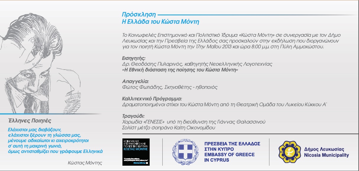 Την Παρασκευή στις 17 Μαΐου, στις 8.00 το βράδυ, στην Πύλη Αμμοχώστου το «Ίδρυμα Κώστας Μόντης», η Πρεσβεία της Ελλάδος και ο Δήμος Λευκωσίας διοργανώνουν εκδήλωση για τον ποιητή Κώστα Μόντη. Όπως είναι γνωστό το 2014 συμπληρώνονται 100 χρόνια από τη γέννηση του μεγάλου Έλληνα Κύπριου ποιητή.