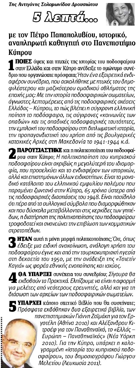 Στην εφημερίδα «Ο Φιλελεύθερος» δημοσιεύθηκε στις 12 Νοεμβρίου 2013 συνέντευξη του Πέτρου Παπαπολυβίου στη δημοσιογράφο Αντιγόνη Σολομωνίδου Δρουσιώτου για το πρόσφατο συνέδριο για την ιστορία του ποδοσφαίρου στην Ελλάδα και στην Κύπρο. Η σύντομη συνέντευξη (στη στήλη «5 λεπτά…») παρατίθεται αμέσως παρακάτω: