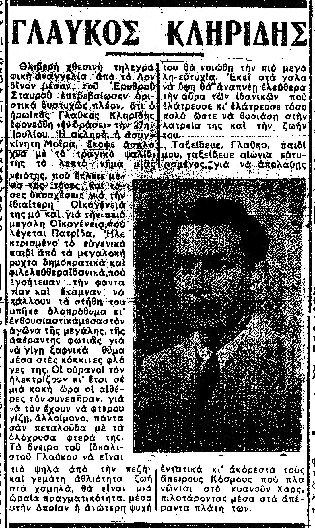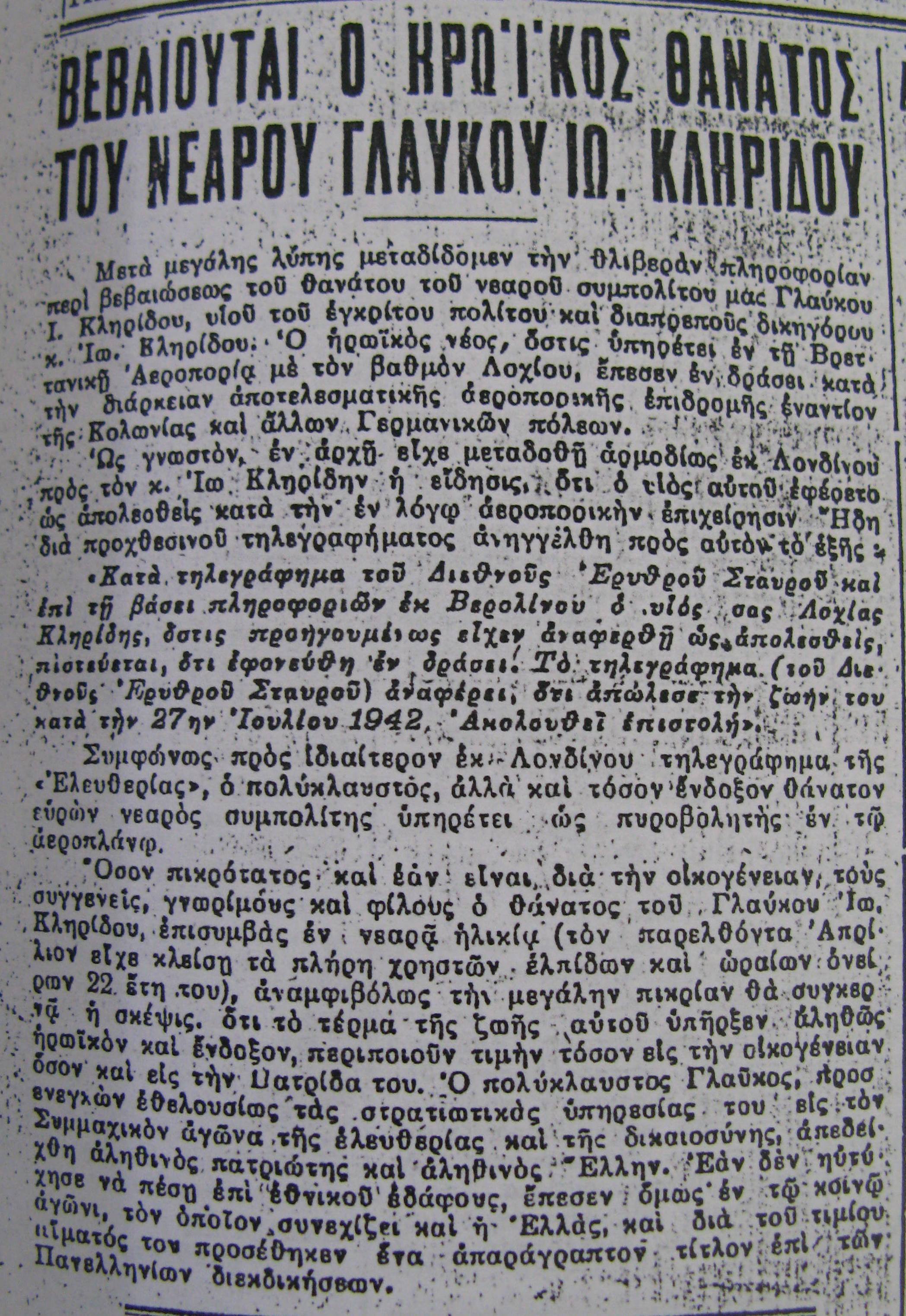 Ένα από πιο αξιοπρόσεκτα επεισόδια της πολυκύμαντης ζωής του αποβιώσαντος προχθές, Παρασκευή 15 Νοεμβρίου, τέως προέδρου της Δημοκρατίας, Γλαύκου Κληρίδη, ήταν η αναγγελία του θανάτου του, τον Σεπτέμβριο του 1942, ένα γεγονός που είχε προκαλέσει μεγάλη συγκίνηση τότε στην Κύπρο.