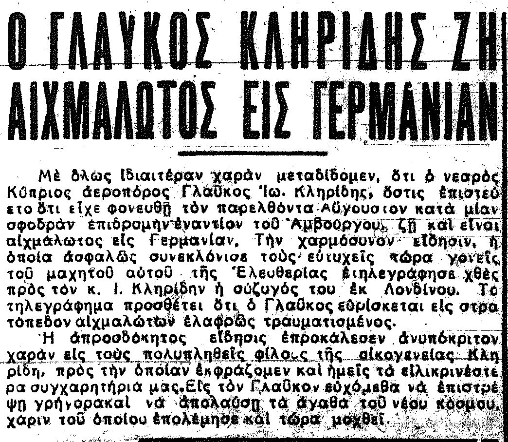 Ο θρήνος για τον νεαρό Γλαύκο Κληρίδη θα κρατούσε τρεις περίπου βδομάδες. Στις 3 Οκτωβρίου 1942 η μητέρα του πήρε γράμμα από την υπηρεσία Αιχμαλώτων του Ερυθρού Σταυρού ότι ο γιος της ζούσε και ήταν «ελαφρώς τραυματίας» σε στρατόπεδο αιχμαλώτων. Τα χαρμόσυνα νέα έφθασαν και στη Λευκωσία τηλεγραφικώς. Έγραφε την επομένη ο «Νέος Κυπριακός Φύλαξ»: «Η απροσδόκητος είδησις επροκάλεσεν ανυπόκριτον χαράν εις τους πολυπληθείς φίλους της οικογενείας Κληρίδη, προς την οποίαν εκφράζομεν και ημείς τα ειλικρινέστερα συγχαρητήριά μας. Εις τον Γλαύκον ευχόμεθα να επιστρέψη γρήγορα και να απολαύση τα αγαθά του νέου κόσμου, χάριν του οποίου επολέμησε και τώρα μοχθεί.»