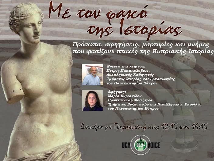 Από τη Δευτέρα 17 Μαρτίου στον Ραδιοφωνικό Σταθμό του Πανεπιστημίου Κύπρου, στον UCY Voice, στους 95.2 στα Fm, θα μεταδίδεται, κάθε Δευτέρα στις 12.15 το μεσημέρι και στις 16.15 και σε επανάληψη τις ίδιες ώρες κάθε Παρασκευή, μια νέα εκπομπή, με τίτλο «Με το φακό της ιστορίας». Στην εκπομπή, η συνεργάτρια του σταθμού, Μαρία Κυριακίδου, φοιτήτρια του Τμήματος Βυζαντινών και Νεοελληνικών Σπουδών διαβάζει τα άρθρα του Πέτρου Παπαπολυβίου που δημοσιεύονται κάθε Σάββατο στην εφημερίδα «Ο Φιλελεύθερος».