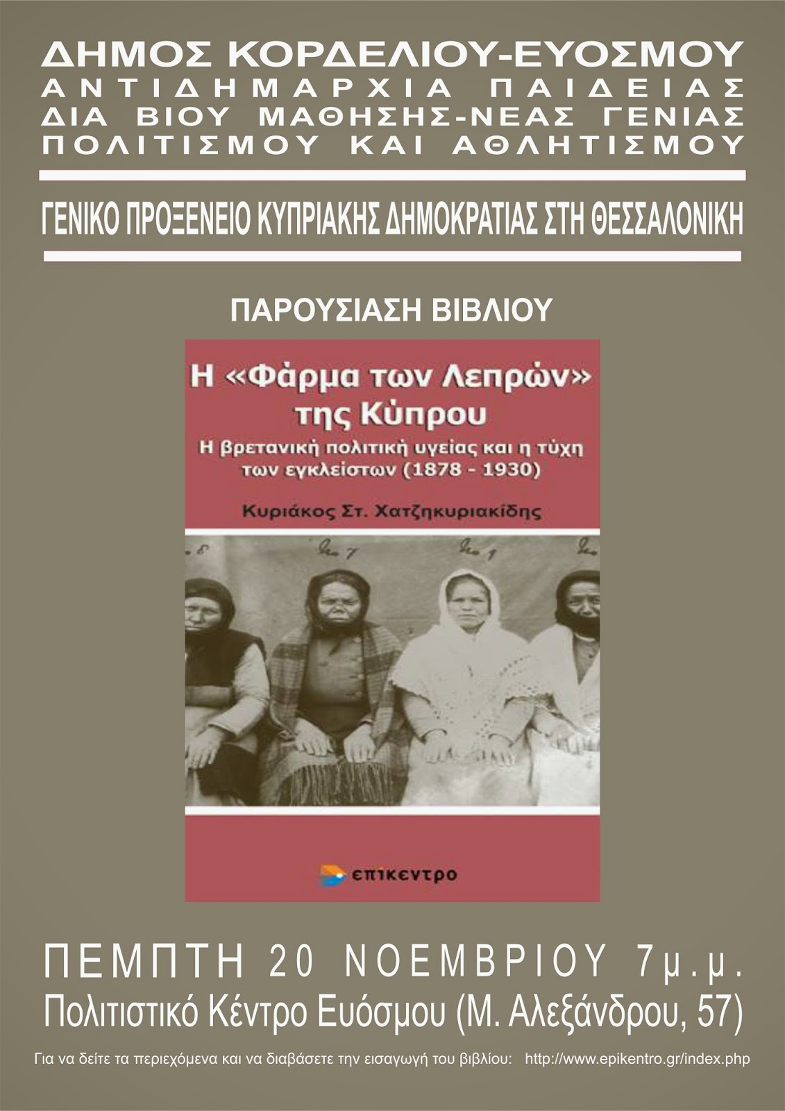 Το βιβλίο «Φάρμα των Λεπρών της Κύπρου», την πρώτη συστηματική μελέτη και παρουσίαση της εξάπλωσης και των προσπαθειών αντιμετώπισης της λέπρας στη μεγαλόνησο στα πρώτα πενήντα χρόνια της Αγγλοκρατίας, του συγγραφέα και διδάκτορα Νεότερης και Σύγχρονης Ιστορίας του ΑΠΘ, Κυριάκου Χατζηκυριακίδη, παρουσιάζει στο πλαίσιο εκδήλωσης ο Δήμος Κορδελιού – Ευόσμου και η Αντιδημαρχία Παιδείας, Πολιτισμού και Αθλητισμού σε συνεργασία με το Γενικό Προξενείο της Κυπριακής Δημοκρατίας στη Θεσσαλονίκη και τις εκδόσεις Επίκεντρο, την Πέμπτη 20 Νοεμβρίου, στις 7 μ.μ., στο Πολιτιστικό Κέντρο Ευόσμου (Μεγάλου Αλεξάνδρου 57).