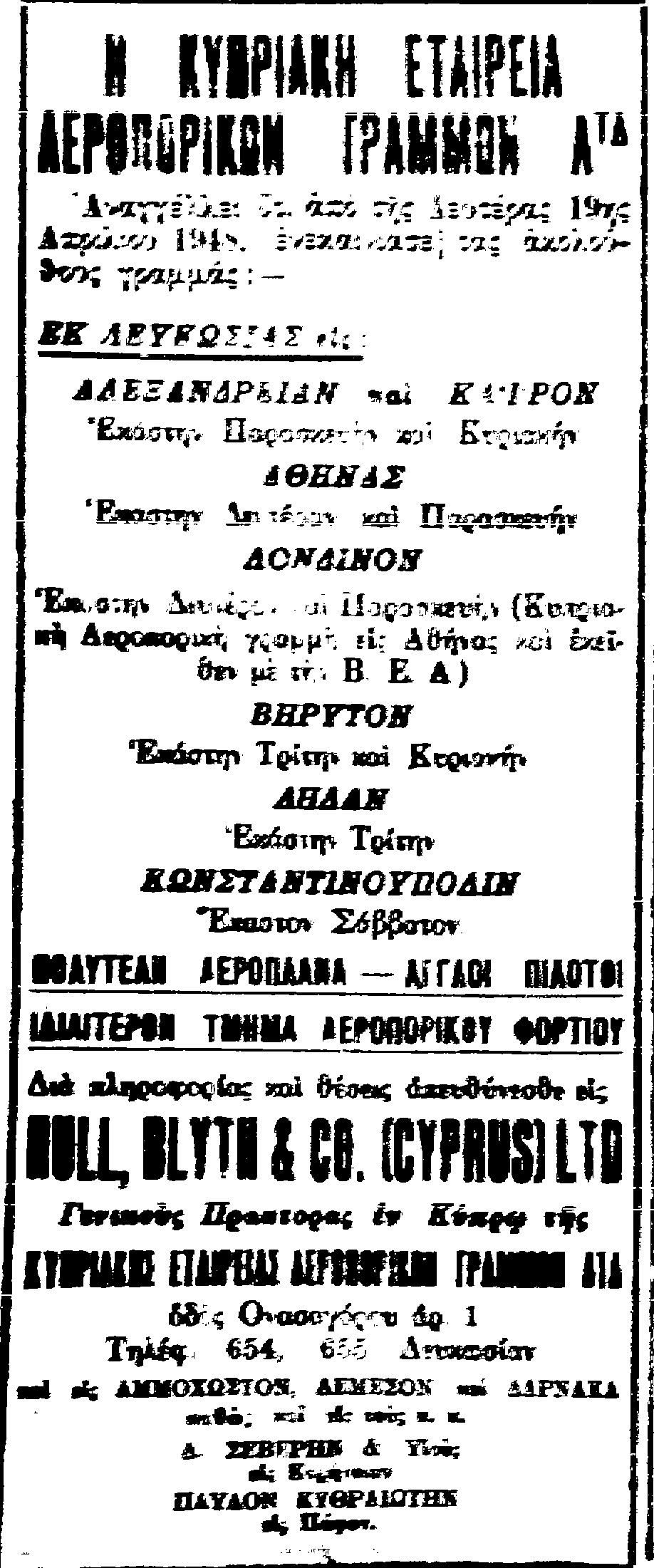 Δείτε, εδώ, την αναγγελία των πρώτων πτήσεων της “Κυπριακής Εταιρείας Αεροπορικών Γραμμών”, τον Απρίλιο του 1948