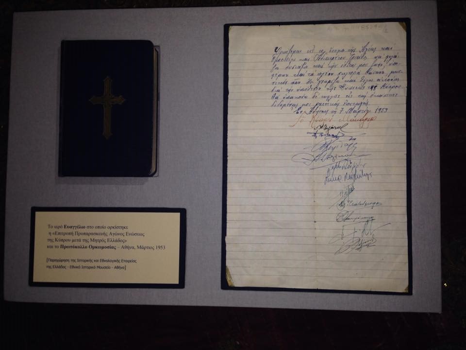 Η παραχώρηση της Καινής Διαθήκης πάνω στην οποία ορκίστηκαν τον Μάρτιο του 1953 οι πρωτεργάτες της ίδρυσης της ΕΟΚΑ και του χειρόγραφου «Όρκου των Αθηνών», με πρώτη την υπογραφή του Αρχιεπισκόπου Μακαρίου Γ΄, αποτελεί μια ακόμη συμβολή του Εθνικού Ιστορικού Μουσείου και της Ιστορικής και Εθνολογικής Εταιρείας της Ελλάδος στην ιστορία της Κύπρου. Στο κτίριο του Μουσείου, στο κέντρο της Αθήνας, όπως είναι γνωστό φυλάσσονται ανεκτίμητοι κυπριακοί θησαυροί: η σημαία των Κυπρίων εθελοντών της επανάστασης του 1821, με την επιγραφή «ΣΗΜΕΑ ΕΛΗΝΗΚΗ ΠΑΤΡΗΣ ΚΗΠΡΟΥ», η προσωπογραφία του εθνομάρτυρα της 9ης Ιουλίου 1821, Αρχιεπισκόπου Κυπριανού, σειρά αυθεντικών κυπριακών ενδυμασιών του τέλους του 19ου αιώνα, 90 φωτογραφίες από την Κύπρο του 1900, που δημοσιεύθηκαν, με επιμέλεια του γράφοντος, στον πρόσφατο τόμο «Η Κύπρος στο γύρισμα του εικοστού αιώνα», και μοναδικά έγγραφα και χάρτες. Όλα αυτά σε ένα κτίριο με πολυσήμαντους συμβολισμούς για τη νεοελληνική ιστορία αλλά και τον κυπριακό αλυτρωτισμό, το κτίριο της «Παλιάς Βουλής», εκεί όπου φιλοδοξούσαν να εισέλθουν ως πληρεξούσιοι και οι ηγέτες του πρώιμου κυπριακού ενωτικού κινήματος.