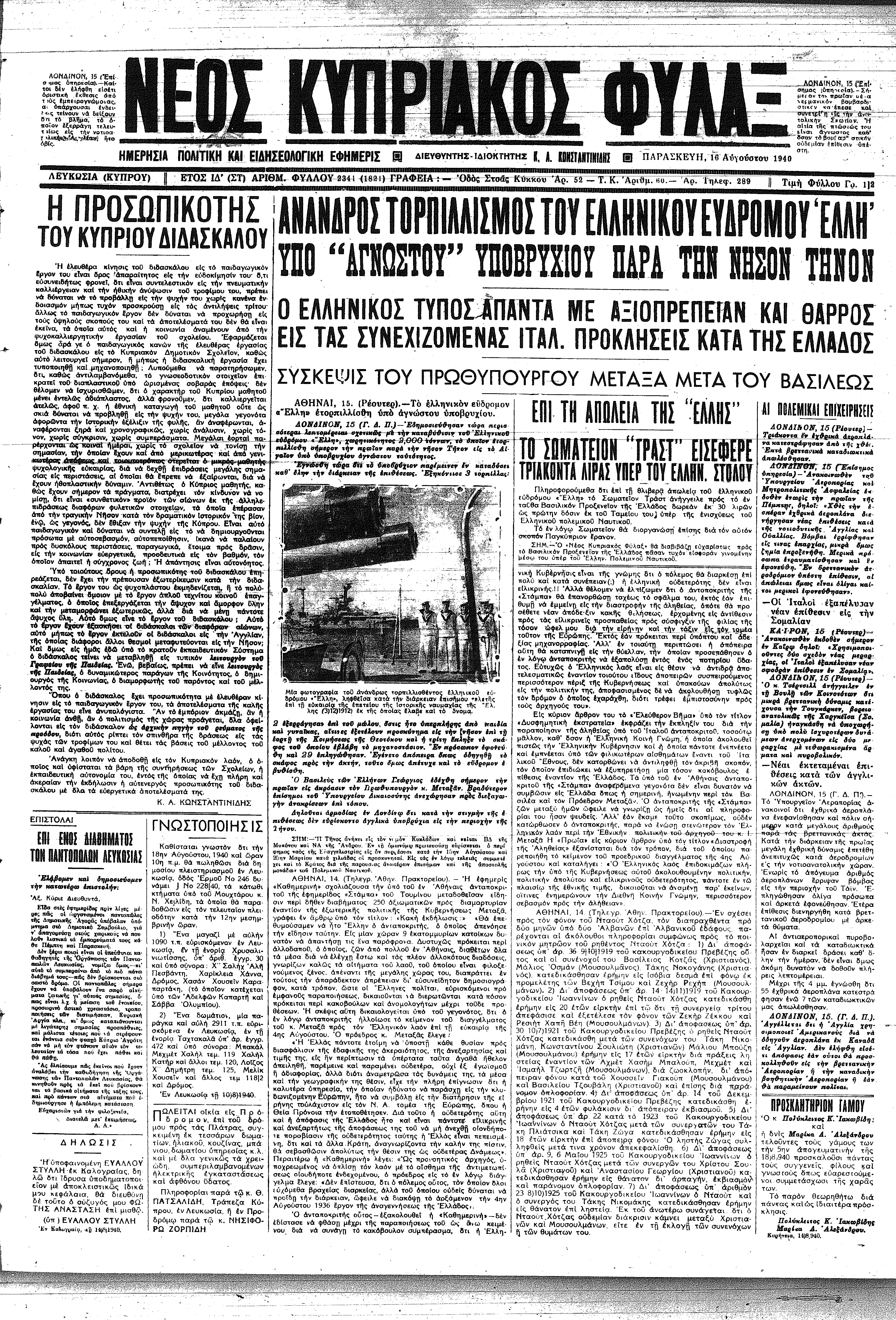 Το πρωτοσέλιδο του «Νέου Κυπριακού Φύλακος» της 16ης Αυγούστου 1940
