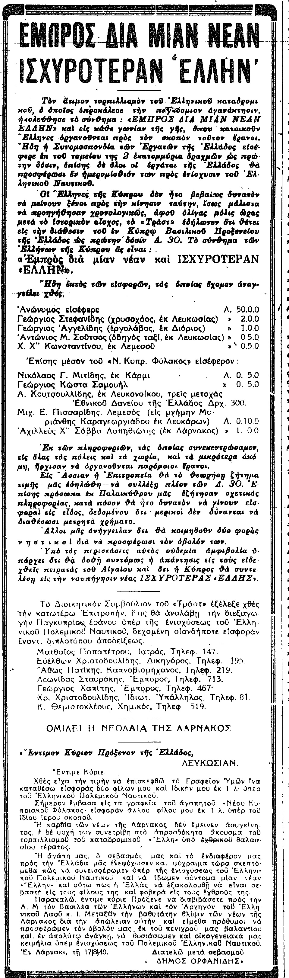 - Ευθύς αμέσως ξεκίνησε μια παγκύπρια ερανική εκστρατεία υπέρ ενίσχυσης του ελληνικού πολεμικού ναυτικού, με σύνθημα «Εμπρός διά μίαν νέαν ισχυροτέραν “Έλλην”». Ήταν, για την περίοδο της σκληρής δικτατορίας που προηγήθηκε στην Κύπρο, της γνωστής με το όνομα «Παλμεροκρατία» (1931-1940) αδιανόητη τόσο για την εκδήλωσή της, όσο και για την έκτασή της. Ο κυβερνήτης Πάλμερ όμως ήταν ήδη στην Αγγλία, οριστικά μακριά από την Κύπρο, ενώ η Βρετανία αναζητούσε συμμάχους εναντίον του Χίτλερ. Για μια ακόμη φορά οι Έλληνες της Κύπρου αυθόρμητα, χωρίς πολιτική οργάνωση και καθοδήγηση, αυτή τη φορά και χωρίς εκκλησιαστική ηγεσία, αφού ο (μοναδικός) μητροπολίτης Λεόντιος βρισκόταν περιορισμένος στην Πάφο, προσέφεραν χιλιάδες λίρες μέσα σε λίγες ημέρες υπέρ της Ελλάδας αποδεικνύοντας τη μαζικότητα και την καθολικότητα του ενωτικού κινήματος, που παρέμεινε ζωντανό εννιά χρόνια ύστερα από την επιβολή της αποικιακής αντεπανάστασης που ακολούθησε την οκτωβριανή εξέγερση του 1931.