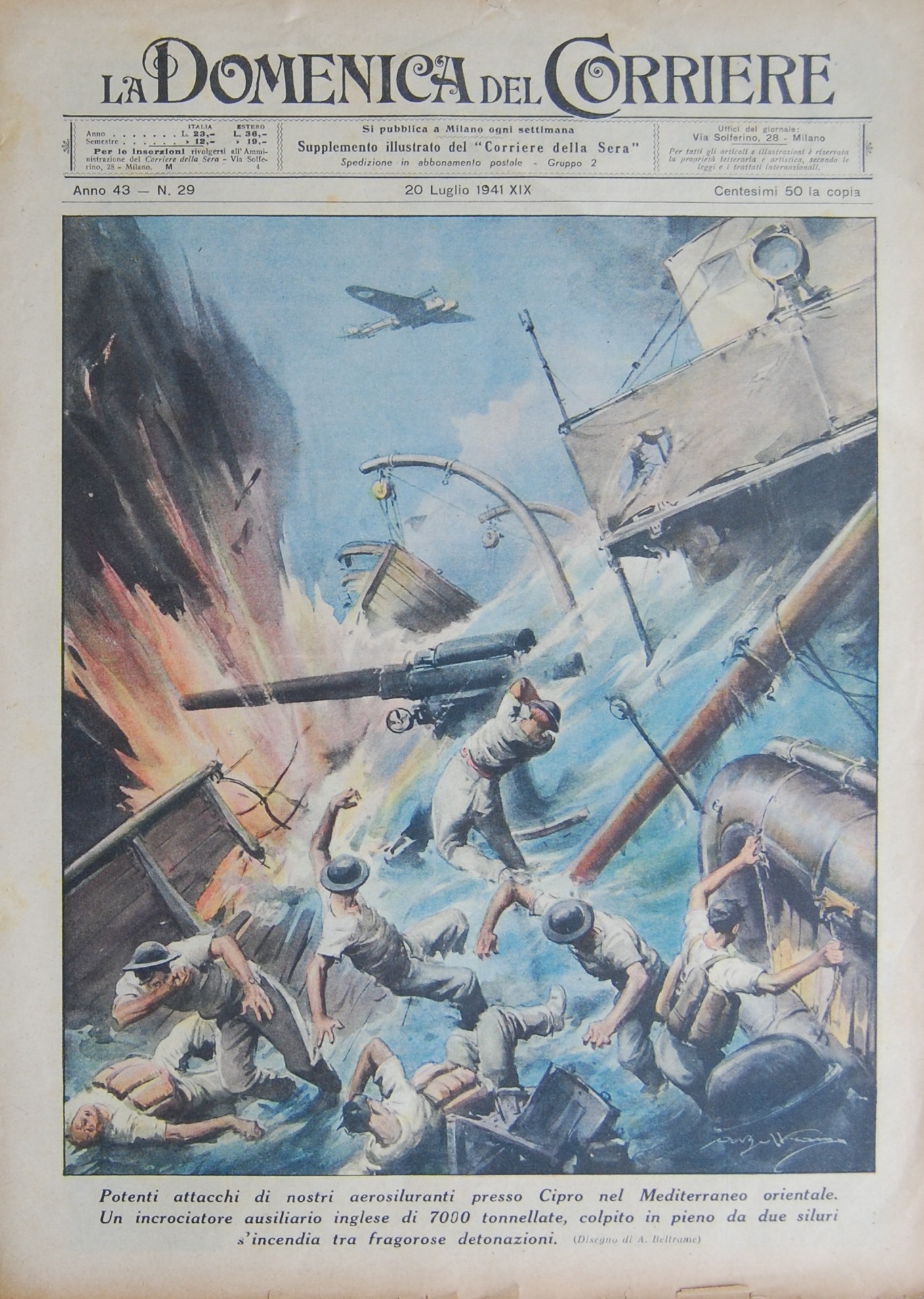 και η άλλη πλευρά: Πρωτοσέλιδο του ιταλικού εντύπου La Domenica Del Corriere, κυριακάτικου ένθετου στην Corriere della Sera, της 20ης Ιουλίου 1941, που αναπαριστά για προπαγανδιστικούς σκοπούς τις επιτυχίες της ιταλικής πολεμικής αεροπορίας στην περιοχή της Κύπρου.