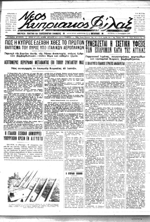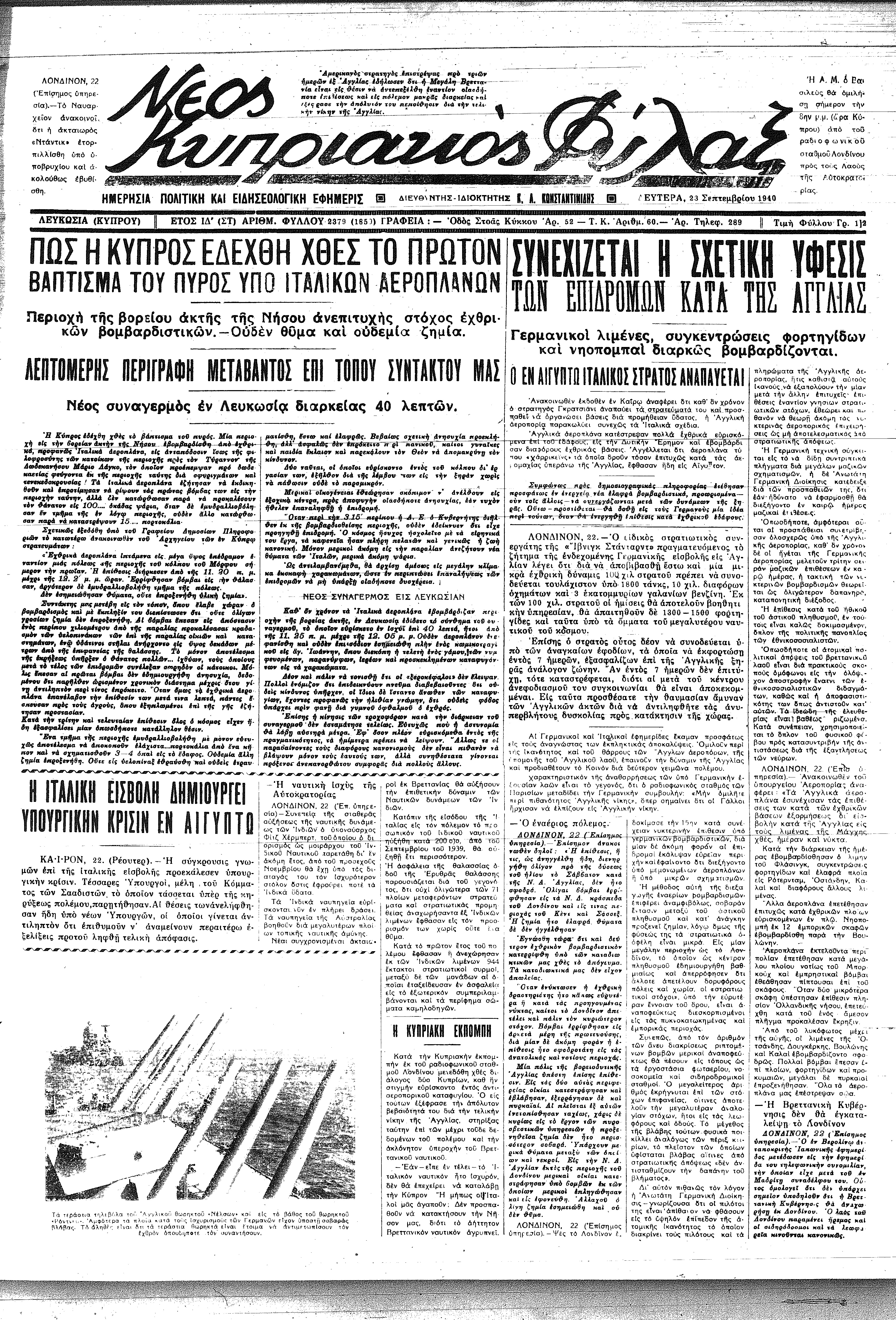 Δείτε το πρωτοσέλιδο της εφημερίδας της Λευκωσίας, “Νέος Κυπριακός Φύλαξ” της 23ης Σεπτεμβρίου 1940, επομένης των πρώτων βομβαρδισμών, με την περιγραφή των γεγονότων αλλά και αναφορά σε κωμικοτραγικά επεισόδια στη Λευκωσία, όπου διακόπηκε ένας γάμος και οι νυμφευόμενοι κατέφυγαν στα καταφύγια, ενώ κακίζεται η “ηλίθια άποψις” των συνηθισμένων ξεροκέφαλων, που “ίσταντο άνωθεν των καταφυγίων”…