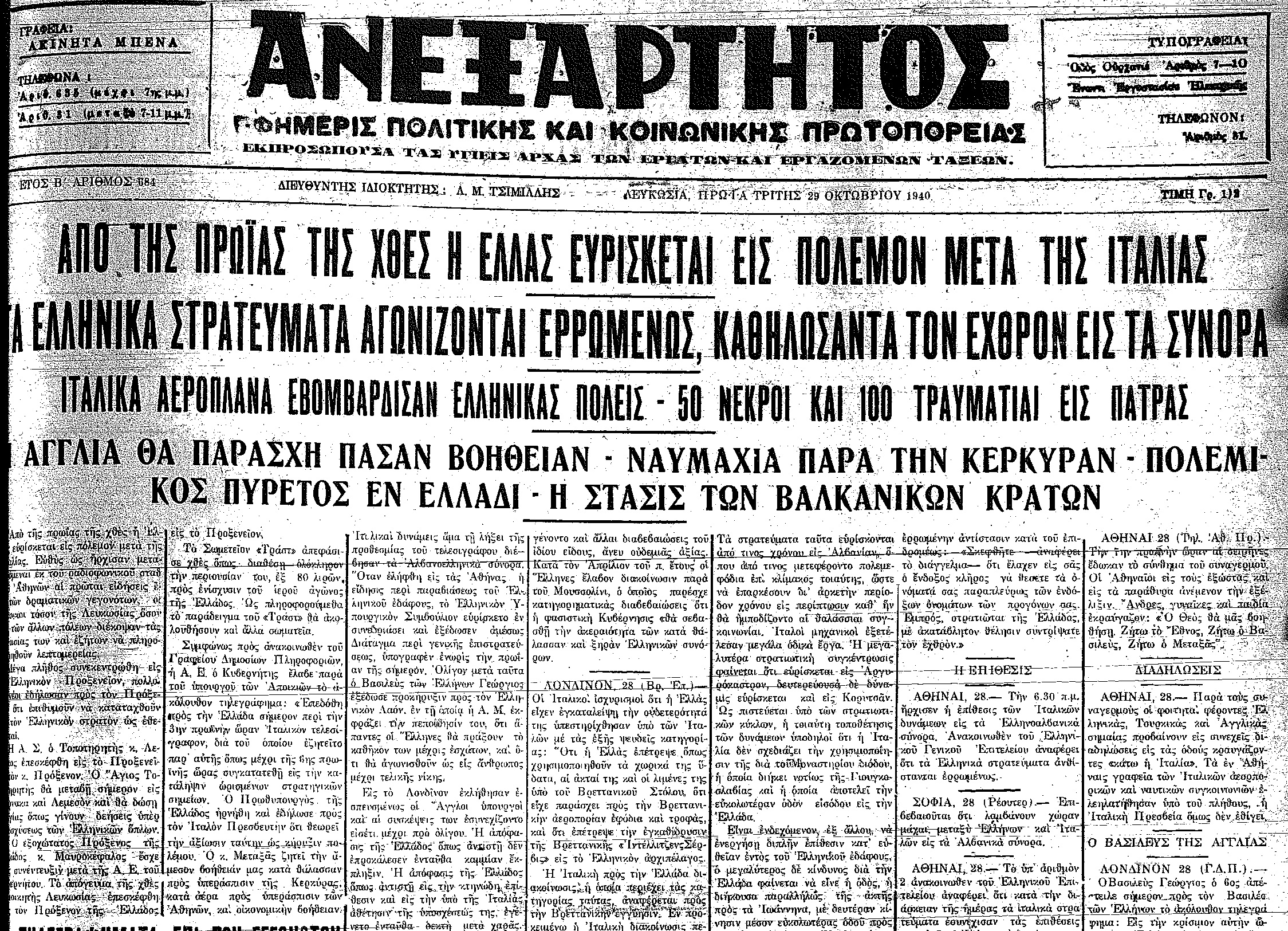Στο επόμενο πρωτοσέλιδο, της ίδιας μέρας (29 Οκτωβρίου 1940), ο «Ανεξάρτητος», του Λύσανδρου Τσιμίλλη, εφημερίδα που πρωτοκυκλοφόρησε στη Λευκωσία τον Νοέμβριο του 1938 και απηχούσε τις απόψεις (ως «συνοδοιπόρος») της κυπριακής Αριστεράς και του ΑΚΕΛ, αργότερα, αναγγέλλει τον ελληνοϊταλικό πόλεμο πιο συγκρατημένα.