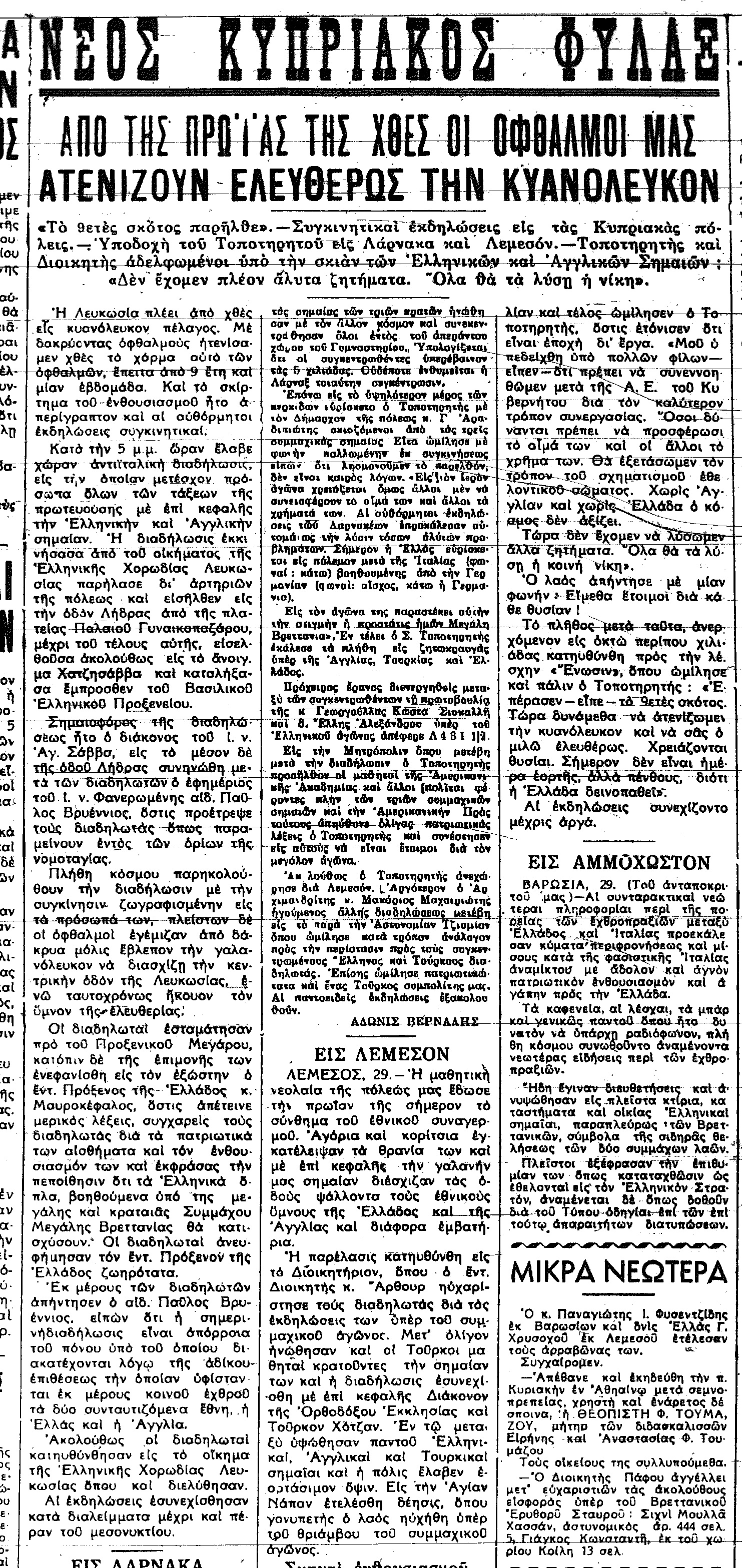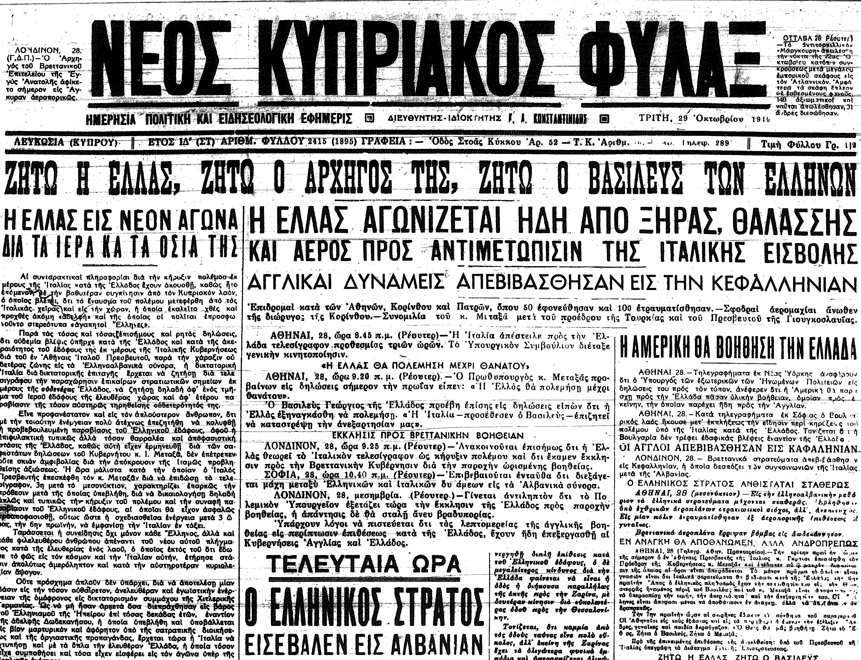 Αμέσως παρακάτω δημοσιεύεται το ενθουσιώδες πρωτοσέλιδο του «Νέου Κυπριακού Φύλακος» της 29ης Οκτωβρίου 1940, μιας από τις παραδοσιακές εφημερίδες του ενωτικού κινήματος, που είχε ιδρύσει ο Νικόλαος Καταλάνος, το 1906.