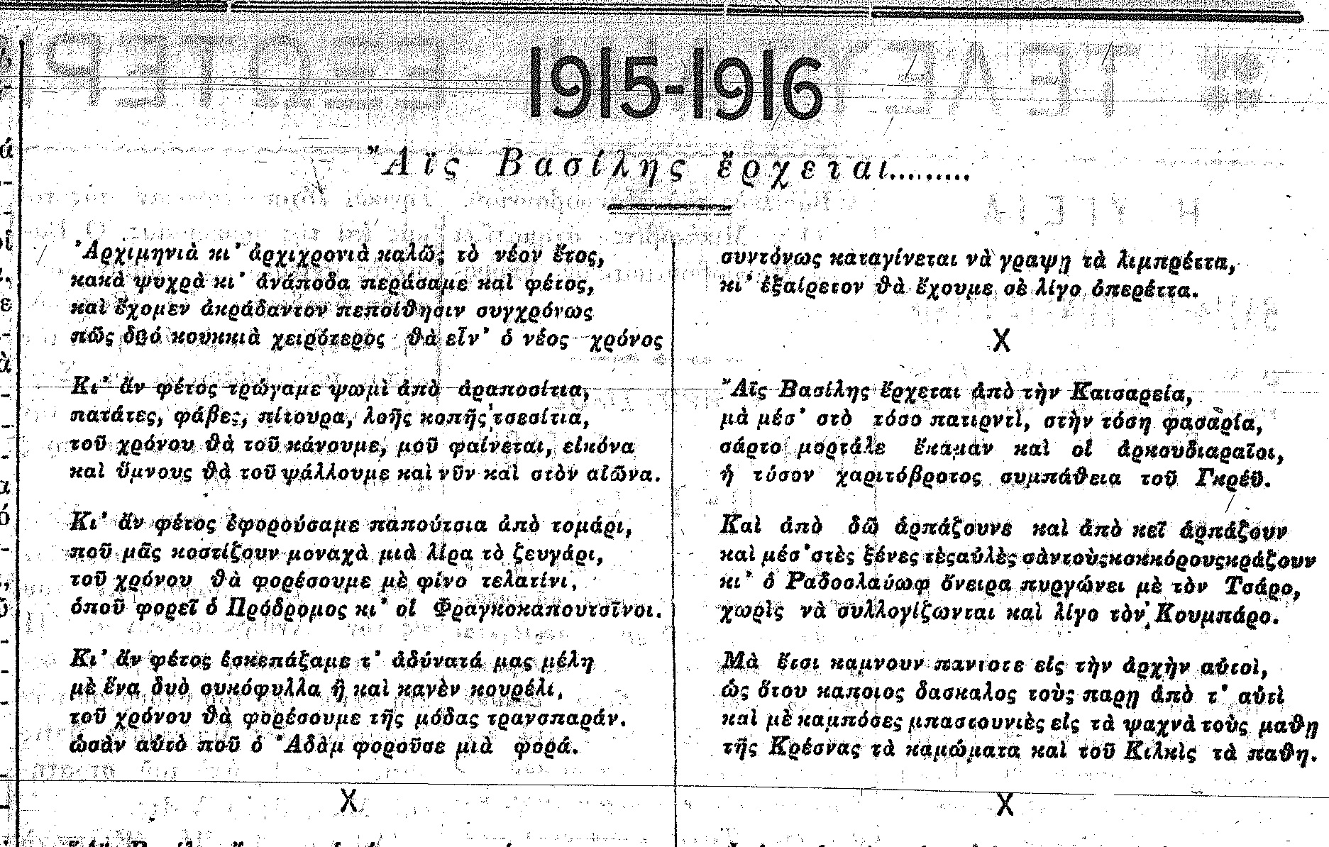 Από την άλλη ιστορική εφημερίδα της Λεμεσού, την «Αλήθεια», του δημοτικιστή και κωνσταντινικού, Μενέλαου Δ. Φραγκούδη, παραθέτω μερικούς στίχους από το ποίημα «1915-1916. Άϊς Βασίλης έρχεται..», που υπέγραφε ο Αναπ., ., δηλαδή ο φιλόλογος Νίκος Θ. Αντωνιάδης («Ανάποδος»). Όπως προβλέπει (διαχρονικά…) το σατιρικό ποίημα, … «δυο κουκκιά χειρότερος, θα ειν’ ο νέος χρόνος»…