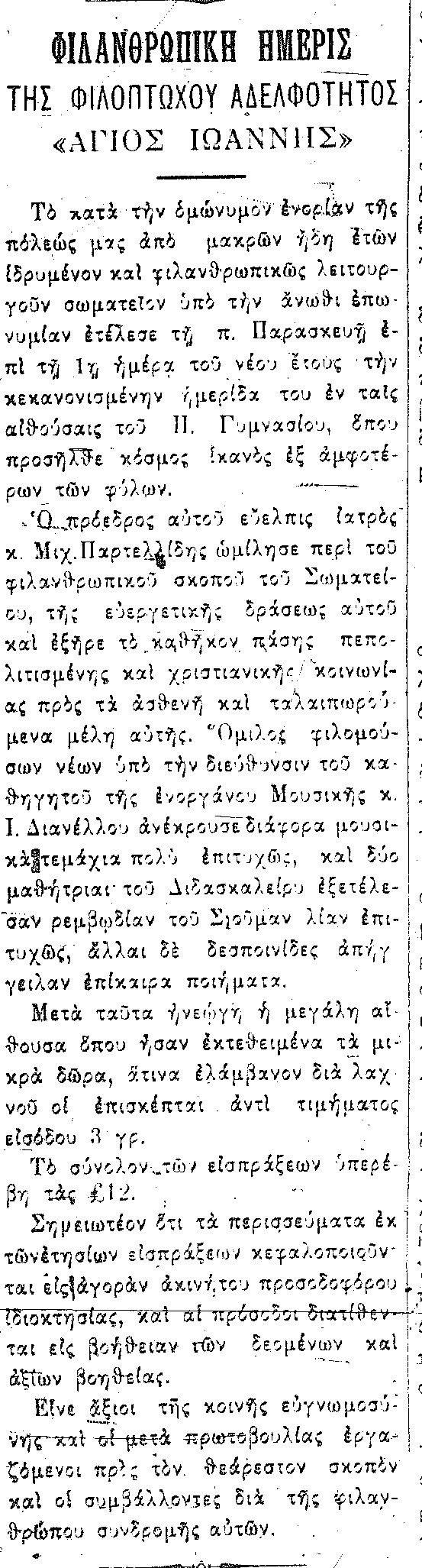 Σε ένα άλλο δημοσίευμα της ίδιας εφημερίδας περιγράφεται η φιλανθρωπική ημερίδα της Φιλοπτώχου Αδελφότητος «Άγιος Ιωάννης», που έγινε σε αίθουσα του Παγκυπρίου Γυμνασίου. Το πιο εντυπωσιακό είναι ότι τα περισσεύματα από τις εισπράξεις υπέρ των πτωχών «κεφαλαιοποιούνται εις αγοράν ακινήτου προσοδοφόρου ιδιοκτησίας», για τον ίδιο σκοπό…