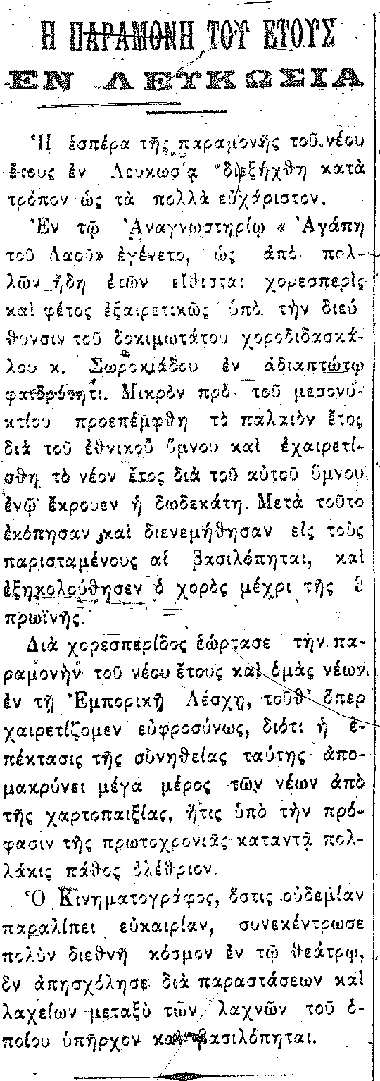 Στη Λευκωσία, ο «Κυπριακός Φύλαξ» του Νικόλαου Καταλάνου, πληροφορεί για την τέλεση χορεσπερίδος «ως από πολλών ήδη ετών είθισται», στο Αναγνωστήριο «Αγάπη του Λαού» του οποίου προήδρευε. Τόσο η αποχώρηση του 1915 όσο και η υποδοχή του νέου έτους, 1916, έγινε με τον εθνικό ύμνο… Ακολούθησε η κοπή των βασιλόπιτων και χορός μέχρι της 3ης πρωινής (!). Ανάλογη χορεσπερίς έγινε και στην Εμπορική Λέσχη, από «ομάδα νέων», ενώ «πολύς διεθνής κόσμος» πέρασε το βράδυ της πρωτοχρονιάς στον κινηματογράφο, όπου ανάμεσα σε παραστάσεις και κλήρωση λαχείων κόπηκαν και εκεί οι βασιλόπιτες.