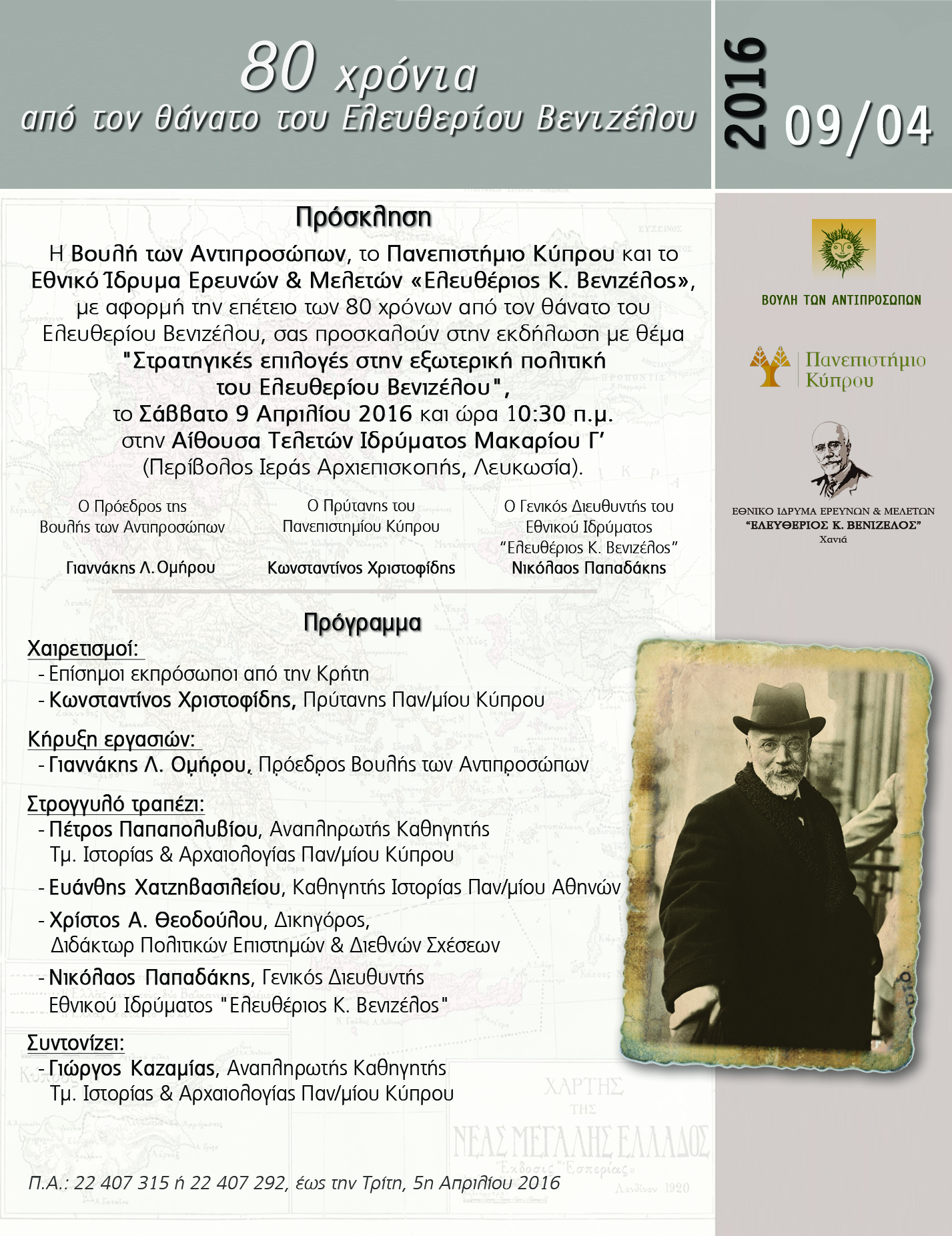 Τιμώντας την επέτειο των 80 χρόνων από τον θάνατο του Ελευθέριου Βενιζέλου, η Βουλή των Αντιπροσώπων, το Πανεπιστήμιο Κύπρου και το Εθνικό Ίδρυμα Ερευνών και Μελετών «Ελευθέριος Κ. Βενιζέλος», οργανώνουν εκδήλωση με θέμα: