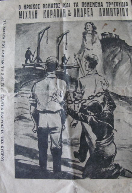 Ενδεικτικό της λαϊκής συγκίνησης για τους απαγχονισμούς των Καραολή και Δημητρίου είναι τα δεκάδες σκίτσα διαμαρτυρίας και πένθους που εντοπίζονται σε ελλαδικές εφημερίδες και περιοδικά της εποχής. Εδώ, από τη συλλογή μου, το εξώφυλλο μιας λαϊκής συλλογής ποιημάτων που κυκλοφόρησαν στην Αθήνα με τα “πονεμένα τραγούδια” για τους Καραολή και Δημητρίου. Η μαυροφορεμένη αλυσοδεμένη Κύπρος συνοδεύει τους δύο ήρωες στις αγχόνες, όπου τους αναμένει η σπαθοφόρος (για να θραύσει τα κυπριακά δεσμά) Ελλάδα, με φόντο τον Παρθενώνα…