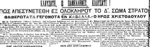 Στη φωτογραφία, η αναγγελία των γεγονότων της παράδοσης του Δ΄ Σώματος Στρατού στη (βενιζελική) «Μακεδονία», στο φύλλο της 31ης Αυγούστου 1916. Η εφημερίδα της Θεσσαλονίκης καλεί τους Πανέλληνες να κλαύσουν…