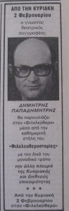 Πρωτοσέλιδο δημοσίευμα στον «Φιλελεύθερο» της 29ης Ιανουαρίου 1986 αναγγέλλει την καθημερινή συνεργασία, από τις 2 Φεβρουαρίου 1986, του Δ. Παπαδημήτρη με την εφημερίδα. Η συνεργασία θα κρατούσε για τα επόμενα 31 χρόνια…