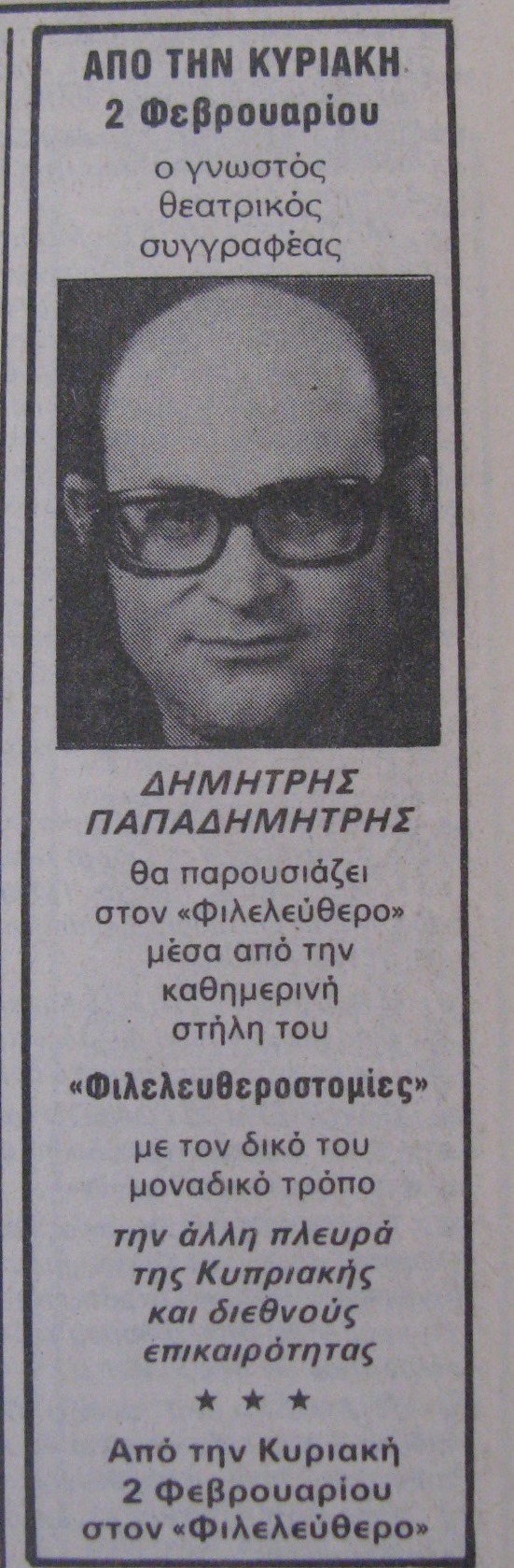 Πρωτοσέλιδο δημοσίευμα στον «Φιλελεύθερο» της 29ης Ιανουαρίου 1986 αναγγέλλει την καθημερινή συνεργασία, από τις 2 Φεβρουαρίου 1986, του Δ. Παπαδημήτρη με την εφημερίδα. Η συνεργασία θα κρατούσε για τα επόμενα 31 χρόνια…