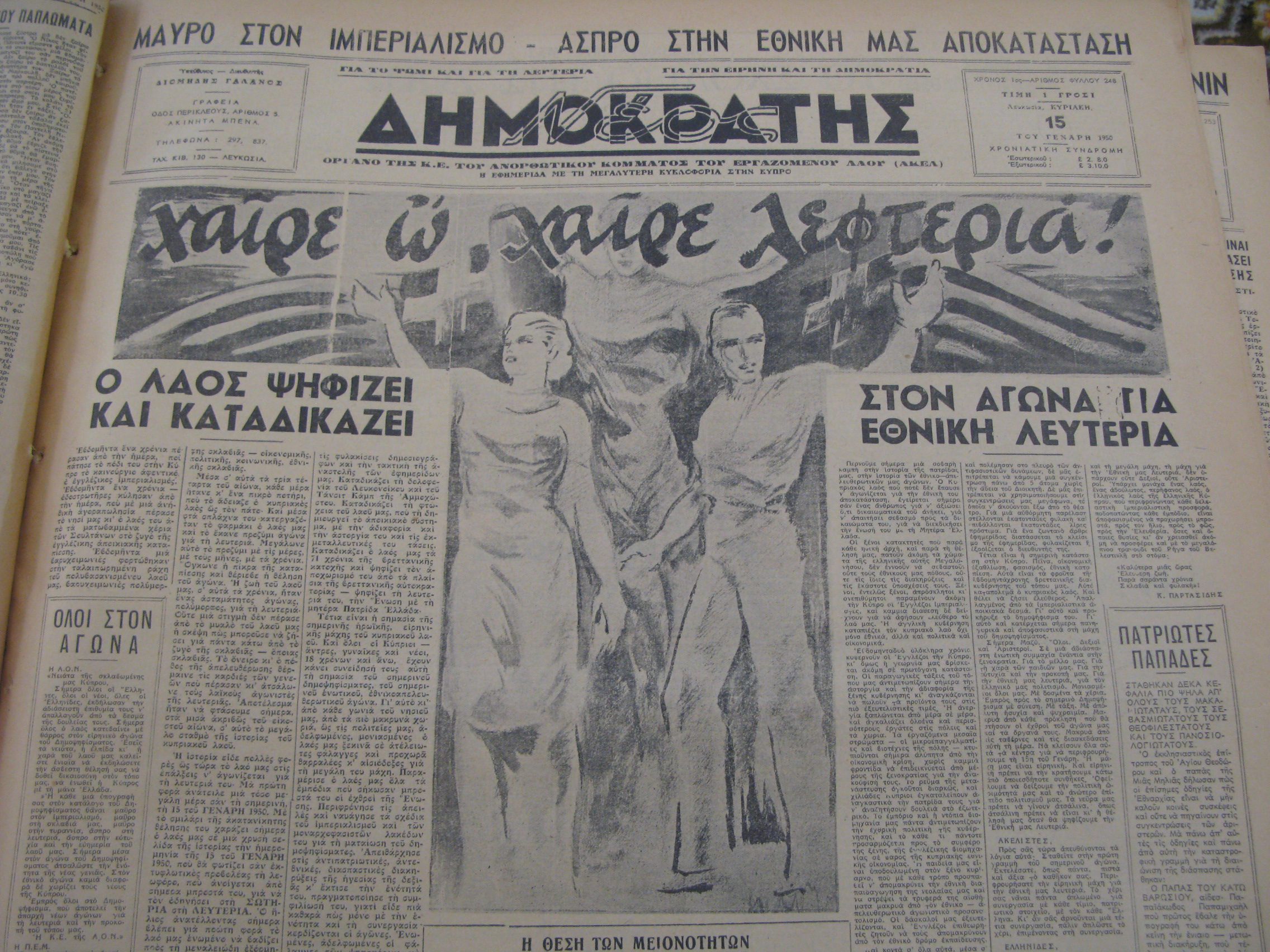 Το πρωτοσέλιδο του “Νέου Δημοκράτη”, της κομματικής εφημερίδας του ΑΚΕΛ, την πρώτη μέρα του ενωτικού δημοψηφίσματος, στις 15 Ιανουαρίου 1950