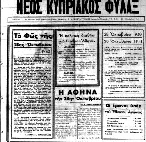 Στη φωτογραφία που ακολουθεί, το πρωτοσέλιδο της εφημερίδας της Λευκωσίας Νέος Κυπριακός Φύλαξ, της 28ης Οκτωβρίου 1941