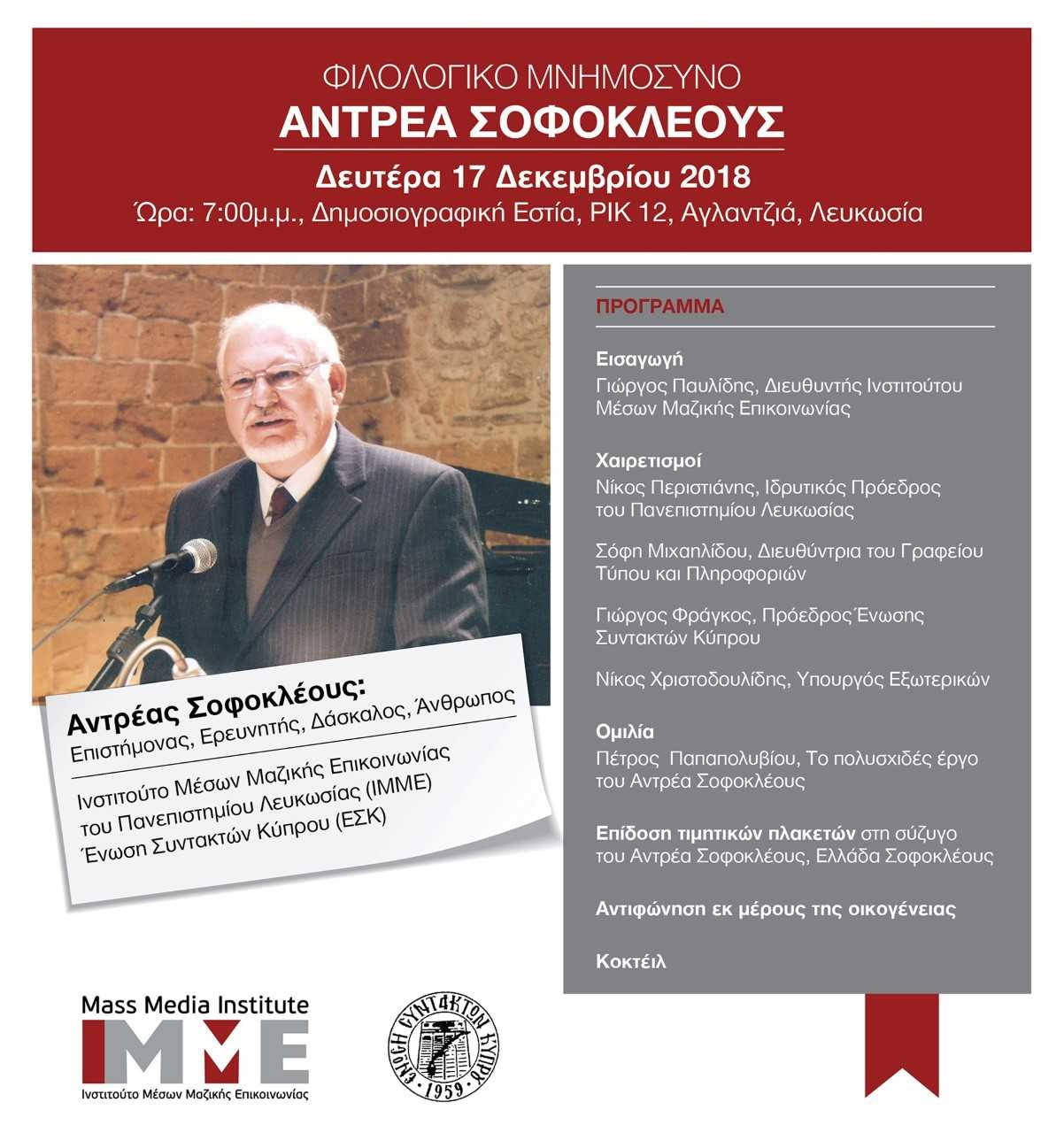 Αύριο, Δευτέρα 17 Δεκεμβρίου 2018, στις 19.00, θα γίνει στη Δημοσιογραφική Εστία, στη Λευκωσία, φιλολογικό μνημόσυνο του αείμνηστου Ανδρέα Κλ. Σοφοκλέους, του ιστορικού του κυπριακού Τύπου, που έφυγε ξαφνικά από τη ζωή τον περασμένο Ιούλιο.