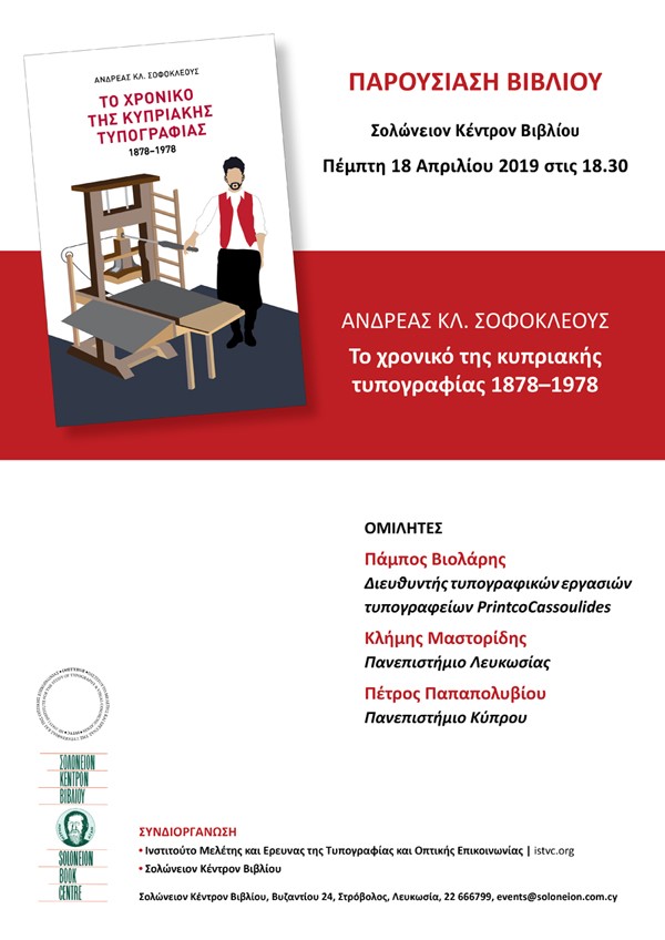 Παρουσιάζεται αύριο 18 Απριλίου 2019, στις 18.30 στο βιβλιοπωλείο “Σολώνειον” στη Λευκωσία, το βιβλίο του αείμνηστου Ανδρέα Κλ. Σοφοκλέους “Το χρονικό της κυπριακής τυπογραφίας 1878-1978”. Πρόκειται για το τελευταίο βιβλίο του πρόωρα χαμένου ιστορικού του κυπριακού Τύπου, που έφυγε από τη ζωή τον περασμένο Ιούλιο. Ο Ανδρέας Κλ. Σοφοκλέους είχε κάνει τις τελευταίες διορθώσεις, είχε πει και το “τυπωθήτω”, όμως το βιβλίο έμελλε να κυκλοφορήσει μεταθανατίως…
