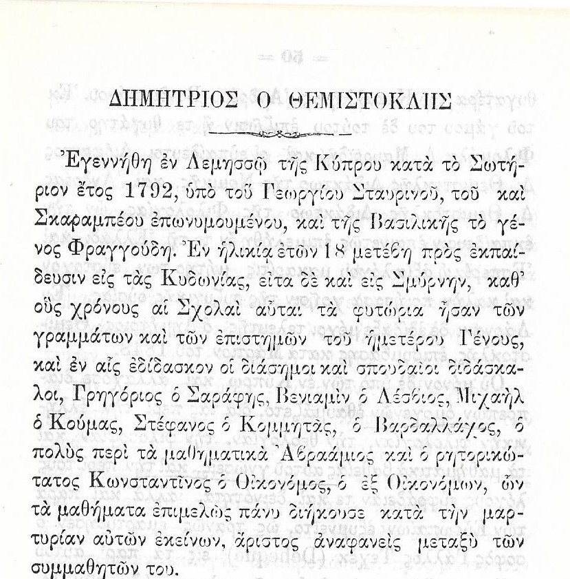 Απόσπασμα από τα “Απομνημονεύματα των κατά το 1821 εν τη νήσω Κύπρω τραγικών σκηνών” του Γ, Ι, Κηπιάδου (Αλεξάνδρεια 1888) όπου και εκτενές βιογραφικό του Δημήτριου Θεμιστοκλέους.