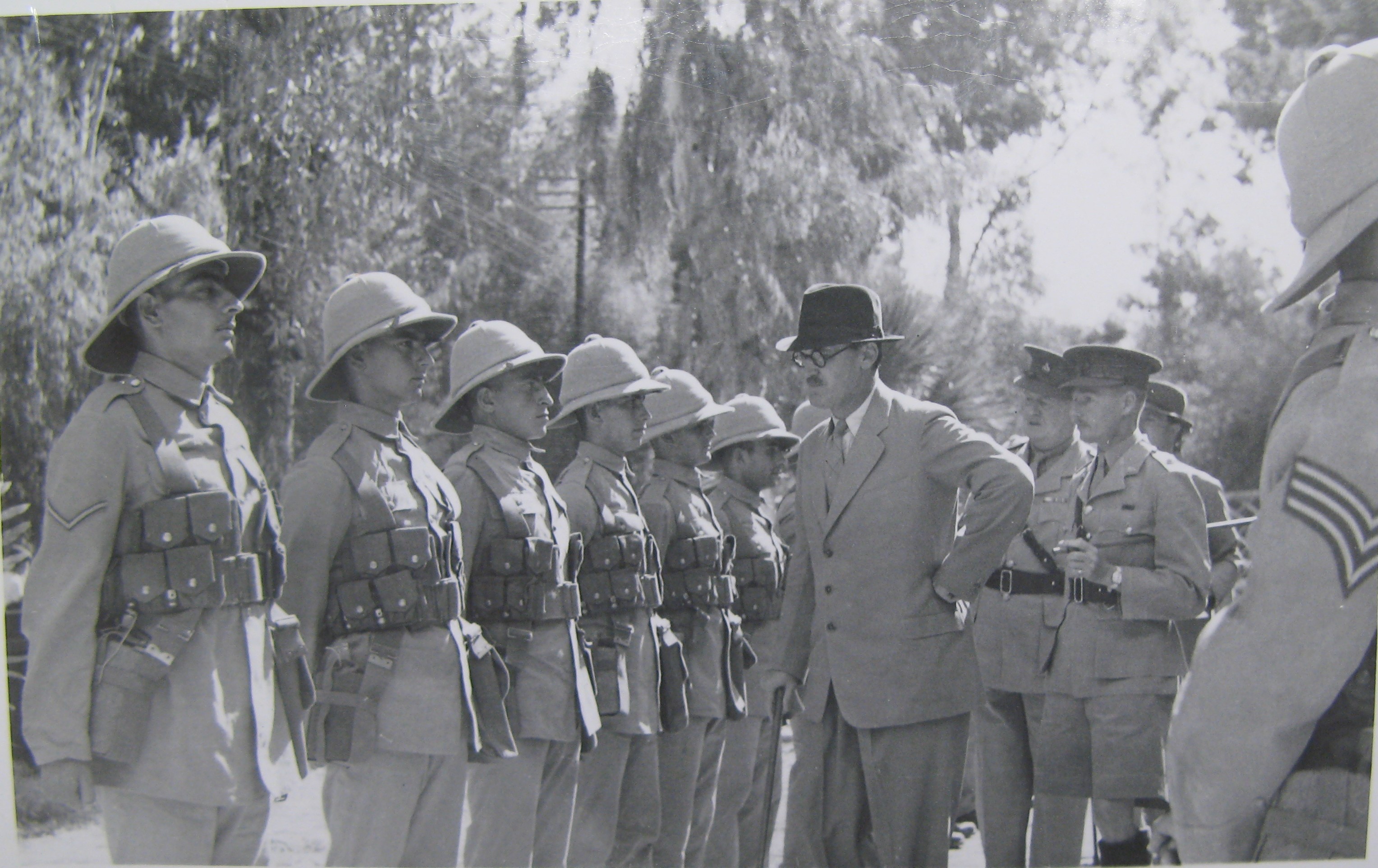 Επιθεώρηση των πρώτων Κυπρίων στρατιωτών που αναχώρησαν από την Κύπρο για την Αίγυπτο, στις 13 Οκτωβρίου 1939, από τον τότε κυβερνήτη της Κύπρου Sir William D. Battershill. Ο Κυβερνήτης φαίνεται σκεφτικός, για άγνωστο λόγο. Σε πρώτο πλάνο ένας Κύπριος υποδεκανέας, από τους έξι συνολικά εκείνης της ομάδας (δύο Τούρκους και τέσσερις Έλληνες σύμφωνα με τους πάντα «ακριβοδίκαιους» Βρετανούς). Η φωτογραφία δημοσιεύθηκε στο Πέτρος Παπαπολυβίου (Εισαγωγή – επιμέλεια), Οι Κύπριοι εθελοντές του Β΄ Παγκοσμίου πολέμου: Τα Μητρώα, οι Κατάλογοι και ο Φόρος του Αίματος, Λευκωσία 2012.