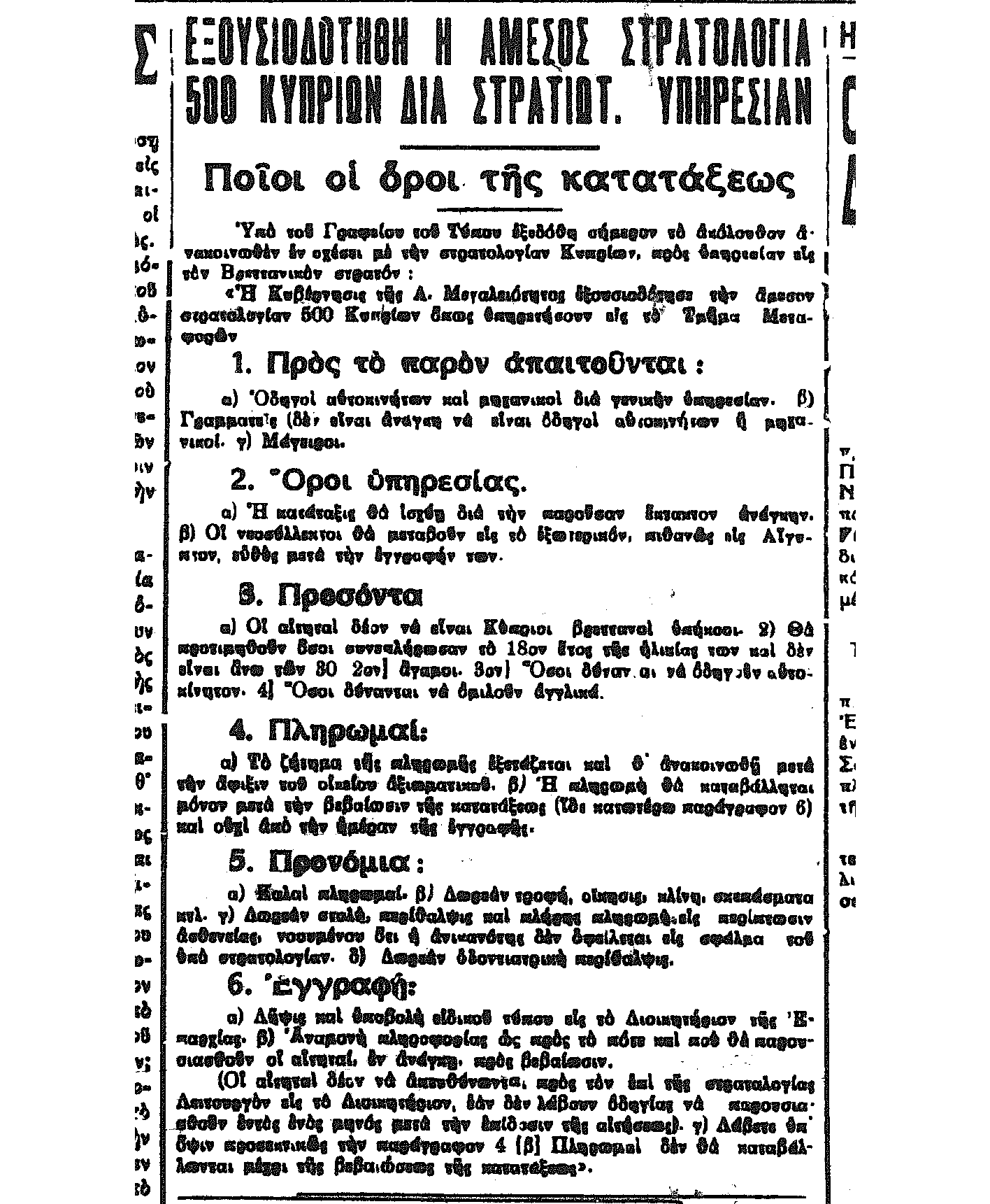 Η ανακοίνωση των αποικιακών αρχών για την πρώτη κατάταξη Κυπρίων στον βρετανικό στρατό για τον Β΄ Παγκόσμιο πόλεμο, όπως δημοσιεύθηκε στις εφημερίδες της Λευκωσίας στις 8 Σεπτ. 1939.