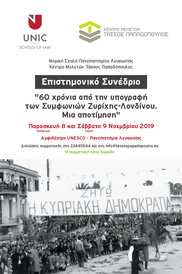 Την Παρασκευή 8 Νοεμβρίου και το Σάββατο 9 Νοεμβρίου 2019, στο Πανεπιστήμιο Λευκωσίας, η Νομική Σχολή του Πανεπιστημίου Λευκωσίας και το Κέντρο Μελετών Τάσσος Παπαδόπουλος οργανώνουν διήμερο συνέδριο με θέμα: “60 χρόνια από την υπογραφή των Συμφωνιών Ζυρίχης – Λονδίνου. Μια αποτίμηση”.