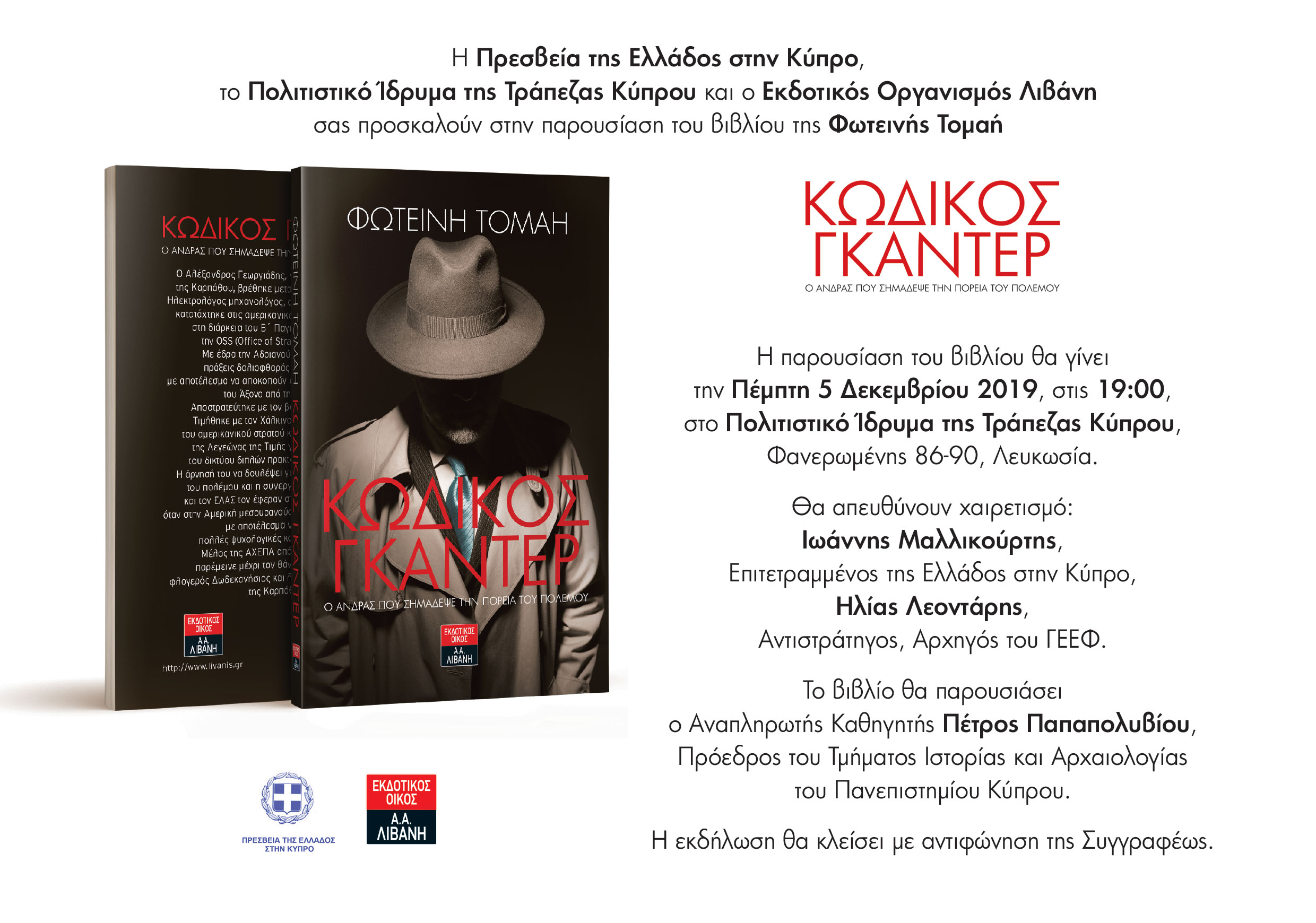 Το Πολιτιστικό Ίδρυμα Τράπεζας Κύπρου και η Πρεσβεία της Ελλάδος στην Κύπρο συνδιοργανώνουν την παρουσίαση του βιβλίου της Φωτεινής Τομαή, «Κωδικός Γκάντερ. Ο άνδρας που σημάδεψε την πορεία του πολέμου». Την Πέμπτη, 5 Δεκεμβρίου 2019, στις 19:00 η ώρα, στο Πολιτιστικό Ίδρυμα Τράπεζας Κύπρου, Φανερωμένης 86-90, στη Λευκωσία.