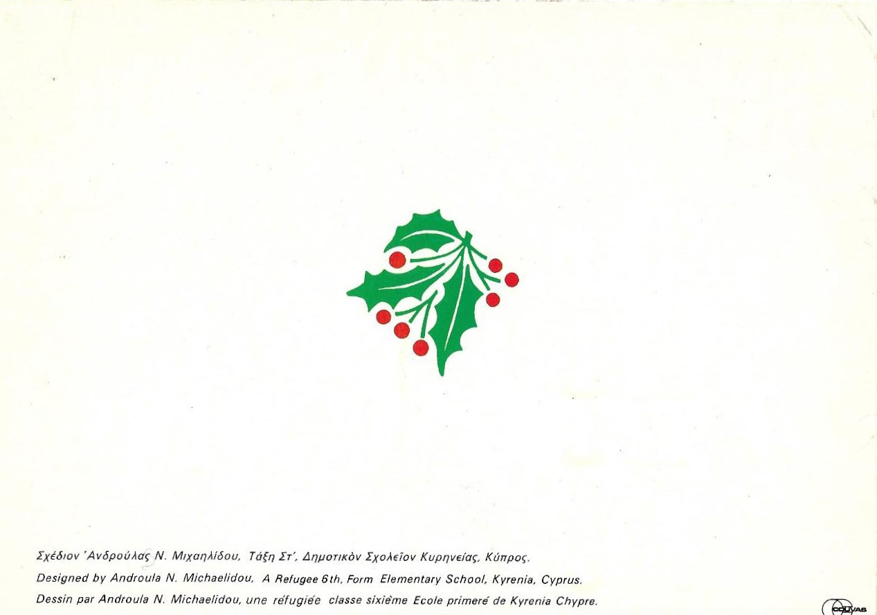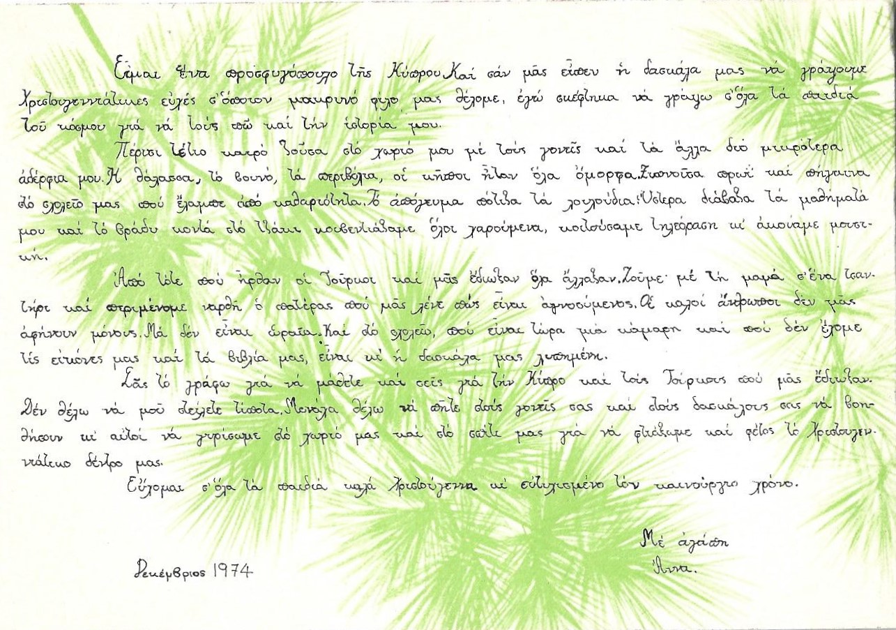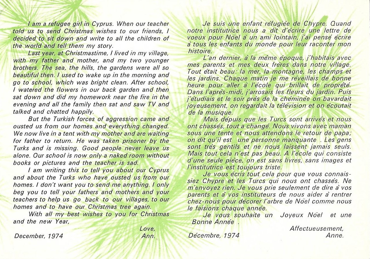 Μια τέτοια κάρτα παρουσιάζει σήμερα, Χριστούγεννα του 2019, το «Περί Ιστορίας», προερχόμενη από μια σειρά χριστουγεννιάτικων καρτών πολύ ευρείας κυκλοφορίας, της οποίας τα έσοδα προορίζονταν για το ταμείο των προσφύγων. Επρόκειτο για μια δίπτυχη κάρτα, συνήθως με μια φωτογραφία στην πρώτη σελίδα (της Αμμοχώστου, της Κερύνειας, παιδικών ζωγραφιών, κ.ο.κ.) και διαφωτιστικό κείμενο στο εσωτερικό της, για πτυχές από τις άμεσες συνέπειες της τουρκικής εισβολής. Η συγκεκριμένη κάρτα έχει στο εξώφυλλο μια ζωγραφιά της μαθήτριας Ανδρούλας Ν. Μιχαηλίδου, της Στ΄ τάξης του Δημοτικού Σχολείου της Κερύνειας, της Κύπρου της ειρηνικής περιόδου, και στο εσωτερικό ένα γράμμα ενός προσφυγόπουλου, της Άννας, με χρονολογία τον Δεκέμβριο του 1974, στη χειρόγραφή του μορφή και σε αγγλική και γαλλική μετάφραση. Παραθέτω και τις τέσσερις σελίδες της κάρτας, επαναλαμβάνοντας τις ευχές και την ελπίδα του προσφυγόπουλου του 1974 για «να γυρίσωμε στο χωριό μας και στο σπίτι μας».
