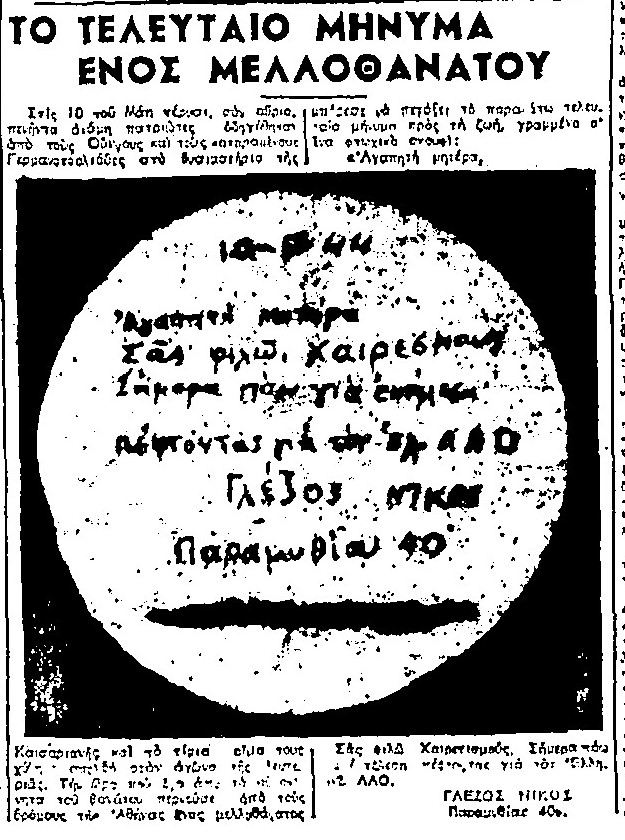 Στην τελευταία περίοδο της Κατοχής, και ενώ πια είχε δυναμώσει η Αντίσταση, αλλά και οι εμφύλιες ελληνικές συγκρούσεις, στις 10 Μαΐου 1944, εκτελέστηκε στο Σκοπευτήριο της Καισαριανής ο μικρότερος αδελφός του, Νίκος Γλέζος, με δεκάδες άλλους αγωνιστές. Στον «Ριζοσπάστη» της 9ης Μαΐου 1945, στην πρώτη επέτειο του θανάτου του, δημοσιεύθηκε η φωτογραφία του σημειώματος που κατάφερε να ρίξει ο θανατοποινίτης από το φορτηγό που τον μετέφερε από το Χαϊδάρι για εκτέλεση: «Σας φιλώ. Χαιρετισμούς. Σήμερα πάω για εκτέλεση πέφτοντας για τον ελ. ΛΑΟ. Γλέζος Νίκος. Παραμυθίας 40». Το δημοσίευμα: