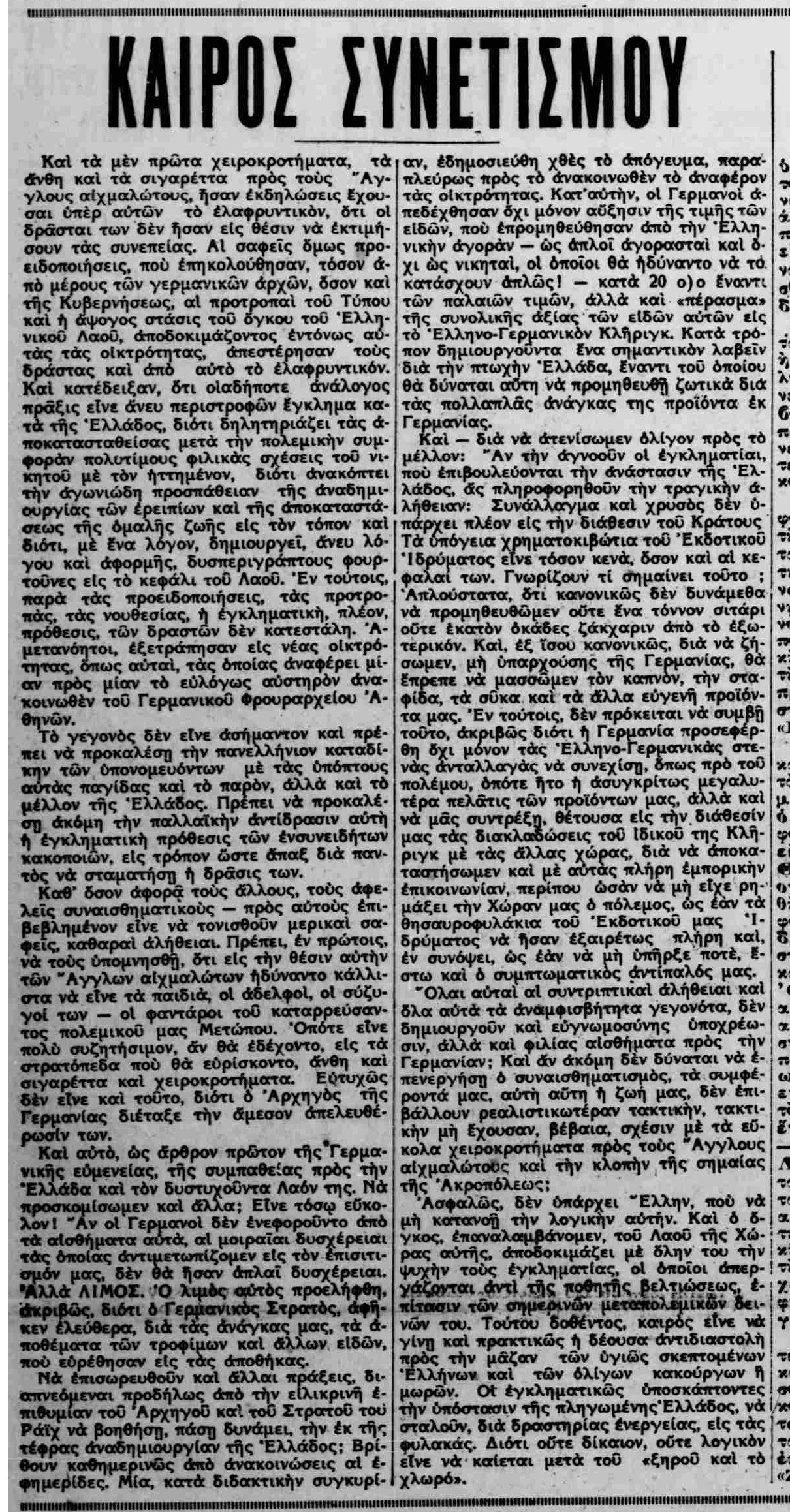 Και το ακόμη πιο αυστηρό κύριο άρθρο της ίδιας εφημερίδας στο ίδιο φύλλο. Είναι χρήσιμο να διαβαστεί για τα (ίδια πάντα) επιχειρήματα των «συνετών» και «υγιώς σκεπτομένων» εναντίον «των ολίγων κακούργων και μωρών», μια μέρα πριν από την επέτειο της 1ης Απριλίου του 1955 και της έναρξης του Αγώνα της ΕΟΚΑ…