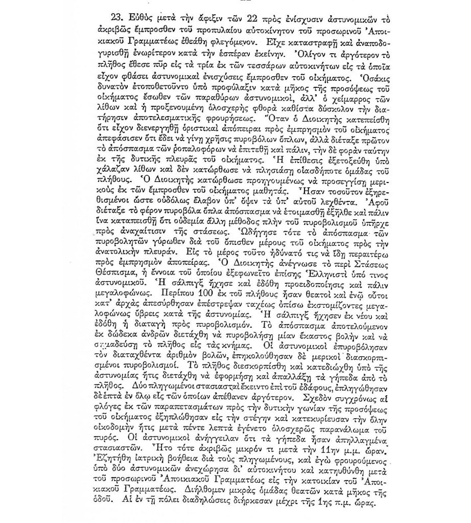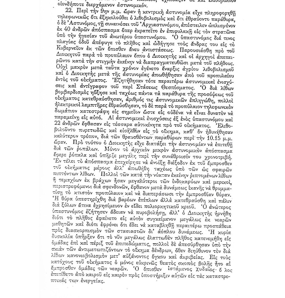 Για την επέτειο των Οκτωβριανών του 1931 παραθέτω δυο παραγράφους από την ελληνική έκδοση της αποικιακής «Λευκής Βίβλου» και συγκεκριμένα από την εκτενή επίσημη έκθεση για τα γεγονότα του τότε κυβερνήτη, Sir Ronald Storrs, με ημερομηνία 1η Φεβρουαρίου 1932. Είναι οι δυο σελίδες (σσ. 13-14) από την έκδοση Ταραχαί εν Κύπρω κατ’ Οκτώβριον, 1931, Λευκωσία: Κυβερνητικόν Τυπογραφείον, 1932, όπου περιγράφεται η τελική φάση της διαδήλωσης στη Λευκωσία, το βράδυ της 21ης Οκτωβρίου 1931, ο εμπρησμός του Κυβερνείου και το πυρ της φρουράς εναντίον του άοπλου πλήθους. Από τα αξιοπρόσεκτα της περιγραφής του Storrs (ο οποίος θρήνησε στο καμένο Κυβερνείο, μαζί με το καταρρακωθέν αυτοκρατορικό κύρος του και την καταστροφή της πολύτιμης συλλογής του σε εικόνες, χειρόγραφα και παλιά βιβλία που είχε συγκεντρώσει, με κάθε τρόπο, “νόμιμο” και μη, για χρόνια, στη Μέση Ανατολή και στην Κύπρο) είναι η έκφραση “χυδαίος όχλος” για τη μάζα των διαδηλωτών και η περιγραφή των …φονικών όπλων των εξεγερμένων στη μαγική νύχτα της 21ης Οκτωβρίου 1931: «λίθοι μεγαλύτεροι των ινδοκαρύων»…
