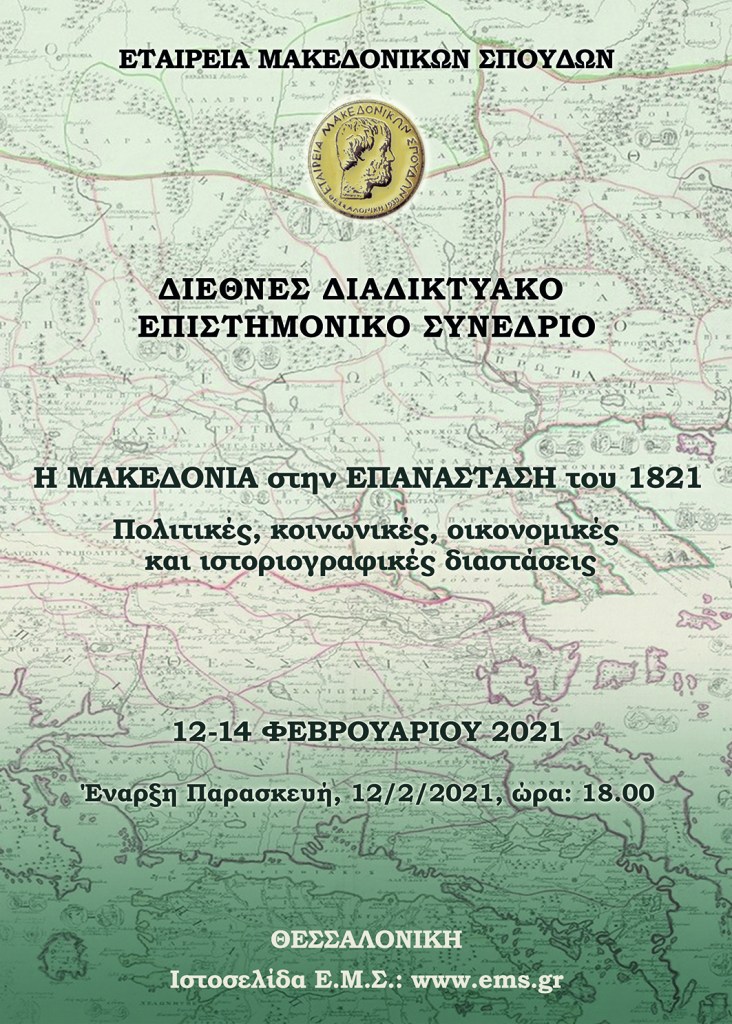 Η Εταιρεία Μακεδονικών Σπουδών, διοργανώνει, στο πλαίσιο των εκδηλώσεών της για τον εορτασμό των διακοσίων χρόνων από την Επανάσταση του 1821, Διεθνές Επιστημονικό Συνέδριο με θέμα: «Η Μακεδονία στην Επανάσταση του 1821: Πολιτικές, κοινωνικές, οικονομικές και ιστοριογραφικές διαστάσεις». Το Συνέδριο θα διεξαχθεί διαδικτυακά μέσω της Ιστοσελίδας της Εταιρείας στις 12-14 Φεβρουαρίου 2021.