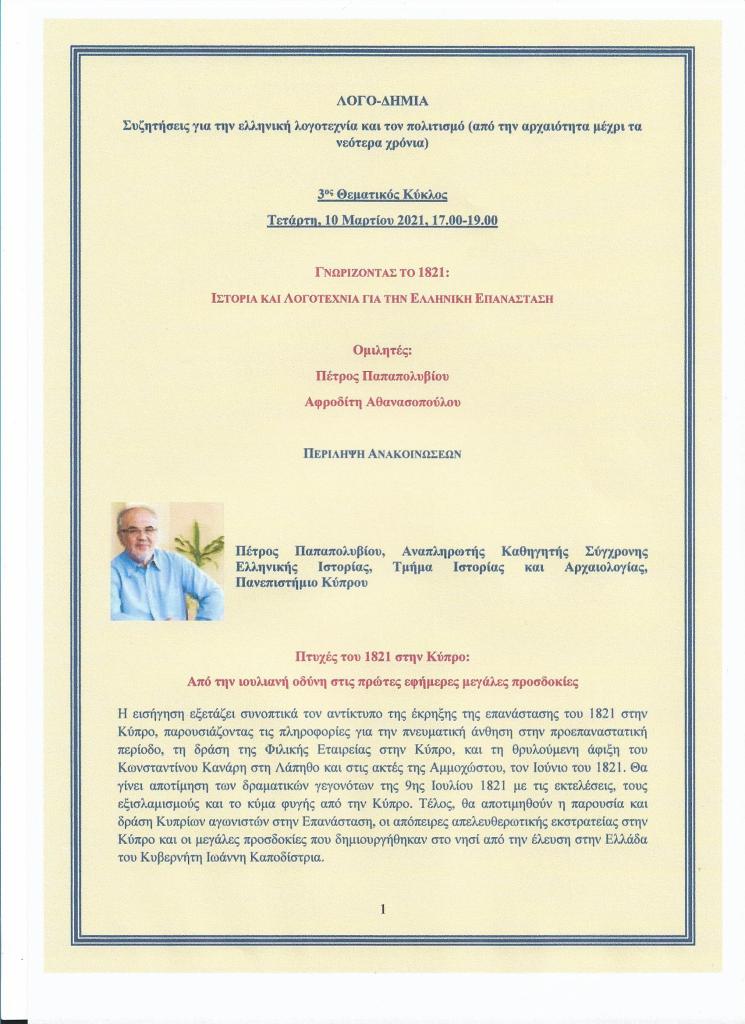 1. Πέτρος Παπαπολυβίου (Αναπληρωτής Καθηγητής Σύγχρονης Ελληνικής Ιστορίας, Τμήμα Ιστορίας και Αρχαιολογίας, Πανεπιστήμιο Κύπρου), «Πτυχές του 1821 στην Κύπρο: Από την ιουλιανή οδύνη στις πρώτες εφήμερες μεγάλες προσδοκίες»
