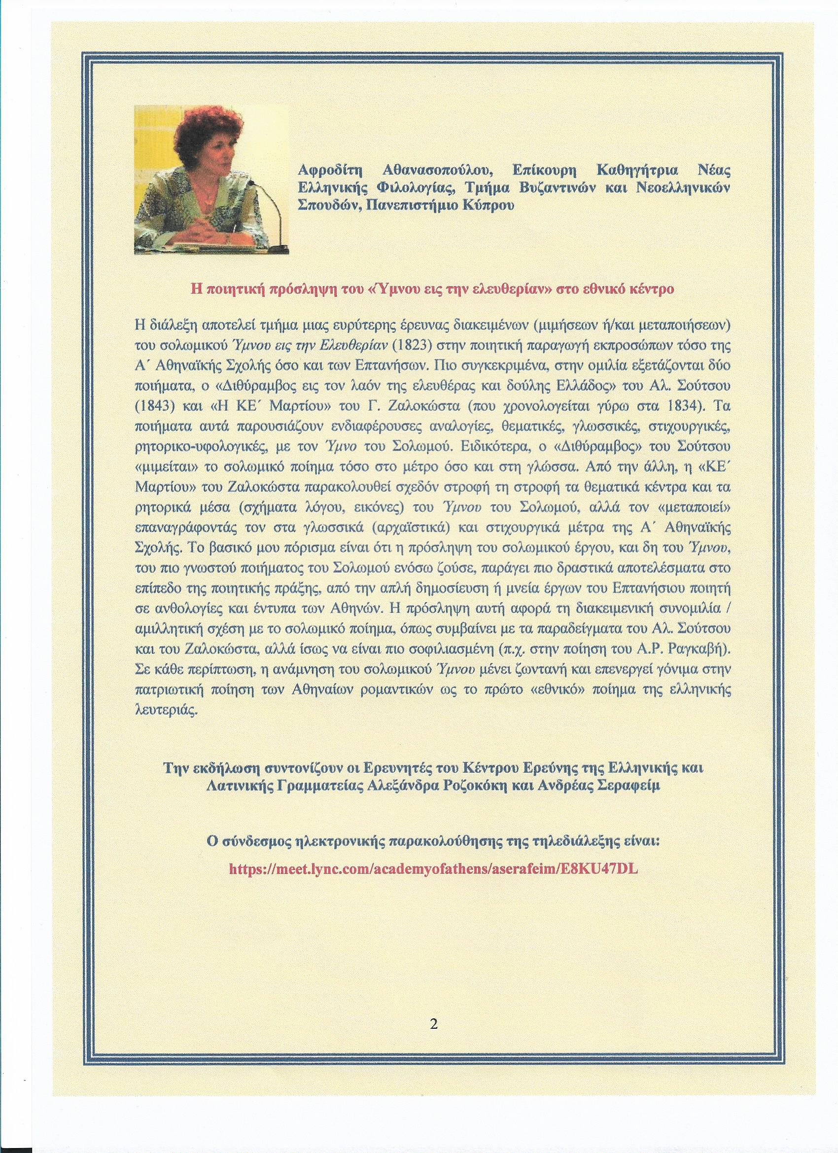 2. Αφροδίτη Αθανασοπούλου (Επίκουρη Καθηγήτρια Νέας Ελληνικής Φιλολογίας, Τμήμα Βυζαντινών και Νεοελληνικών Σπουδών, Πανεπιστήμιο Κύπρου), «Η ποιητική πρόσληψη του Ύμνου εις την ελευθερίαν στο εθνικό κέντρο»