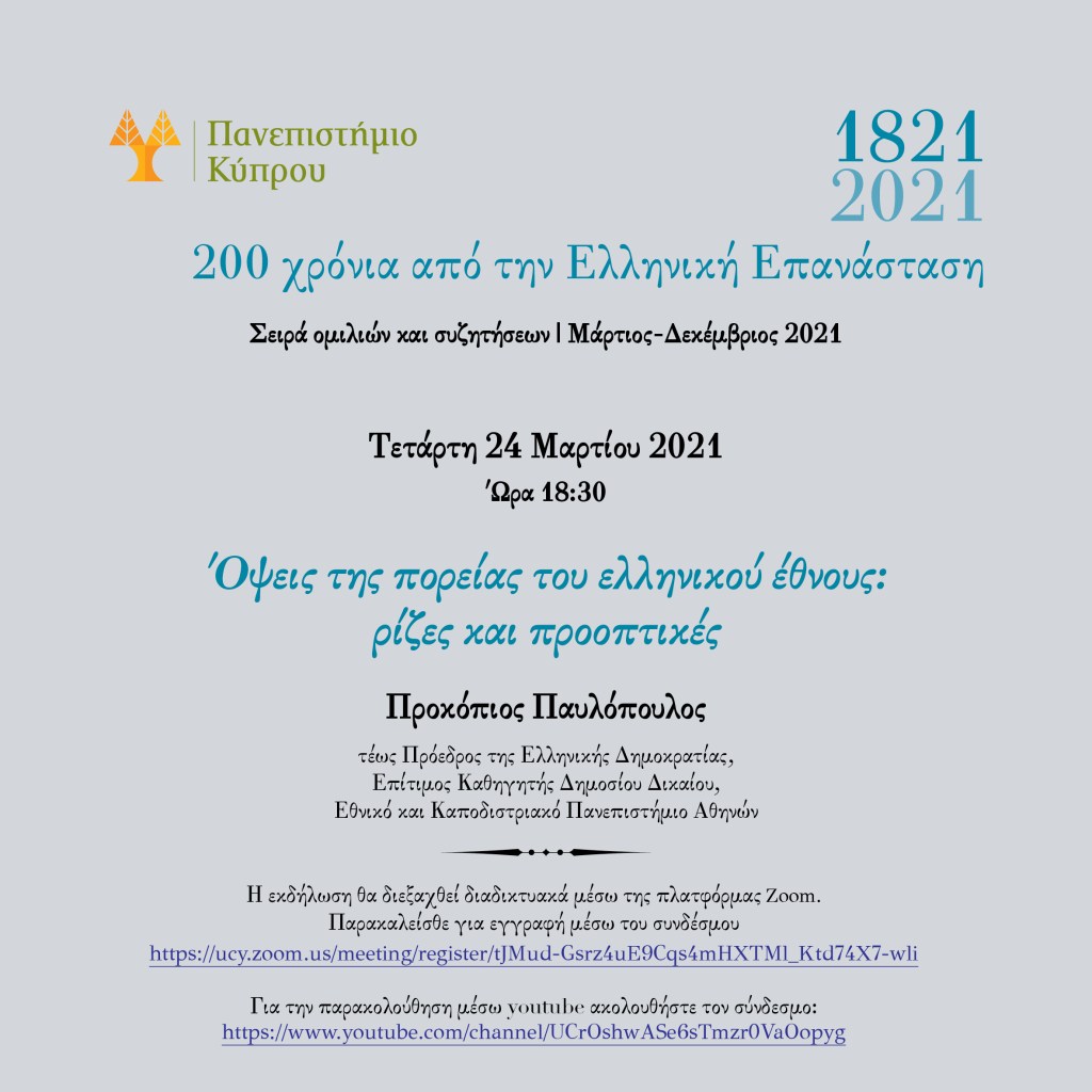 Το Πανεπιστήμιο Κύπρου σας προσκαλεί στην 4η εκδήλωση του πρώτου κύκλου ομιλιών και συζητήσεων με τίτλο «1821-2021, 200 χρόνια από την Ελληνική Επανάσταση». Η εκδήλωση θα πραγματοποιηθεί την Τετάρτη 24 Μαρτίου 2021, στις 18:30. Περιλαμβάνει ομιλία του Προκόπη Παυλόπουλου, τέως Πρόεδρου της Ελληνικής Δημοκρατίας και Επίτιμου Καθηγητή Δημοσίου Δικαίου του Εθνικού και Καποδιστριακού Πανεπιστήμιου Αθηνών. Θέμα της ομιλίας του κ. Παυλόπουλου είναι: «Όψεις της πορείας του ελληνικού έθνους: ρίζες και προοπτικές».