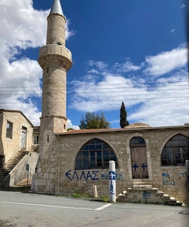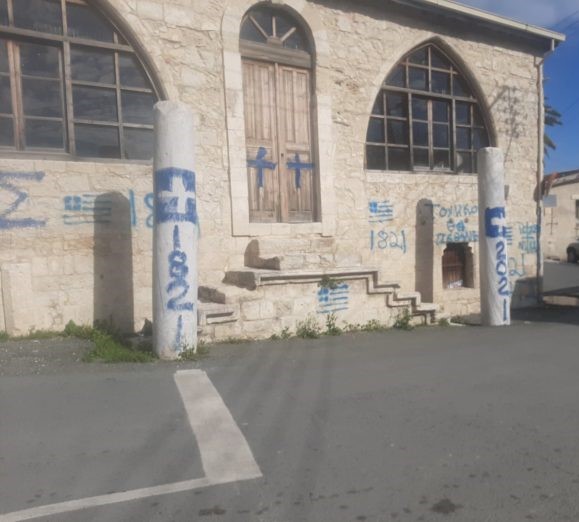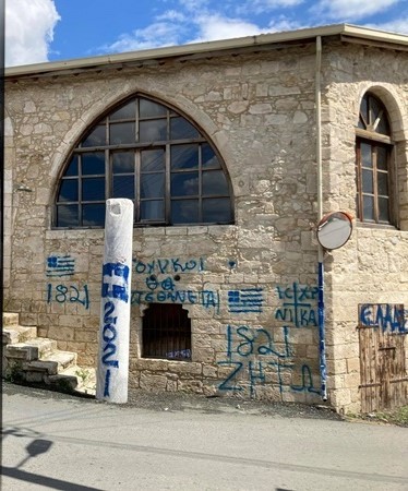 Πριν μερικές μέρες, τις ίδιες ώρες που κορυφώνονταν οι επετειακοί εορτασμοί για τα 200 χρόνια από την έναρξη της Ελληνικής Επανάστασης, άγνωστοι νυκτοβάτες μαγάρισαν τους τοίχους του μουσουλμανικού τεμένους στο χωριό Επισκοπή Λεμεσού, γράφοντας τη λέξη Ελλάς, την ελληνική σημαία και άλλα ανάλογα συνθήματα. Βλ. τις φωτογραφίες: