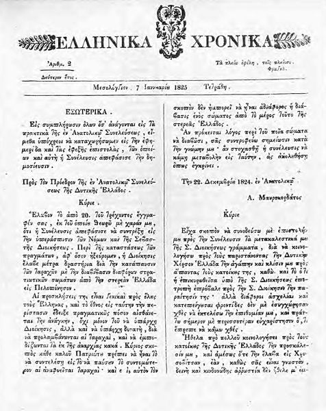 Πρωτοσέλιδο των “Ελληνικών Χρονικών” του Μεσολογγίου (φ. 7 Ιανουαρίου 1825)