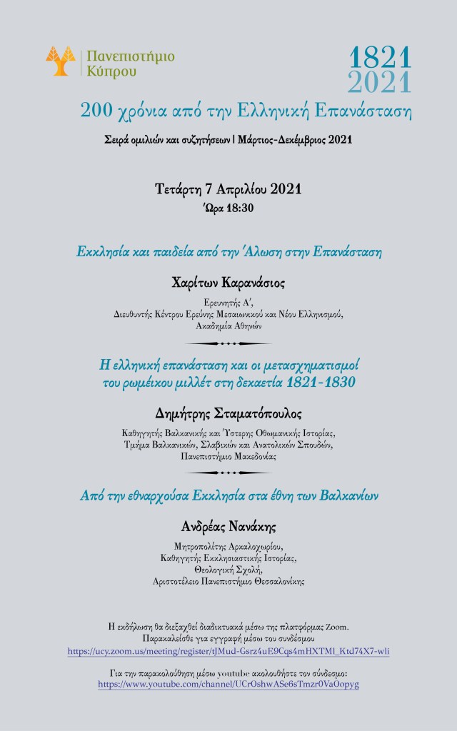 Η σημερινή (7 Απριλίου 2021) έκτη διαδικτυακή εκδήλωση του Πανεπιστημίου Κύπρου, στη σειρά των διαλέξεων για τα 200 χρόνια από την Ελληνική Επανάσταση του 1821 έχει τίτλο “Η Εκκλησία και το 1821”. Σήμερα, Τετάρτη 7 Απριλίου 2021 και ώρα 18:30.