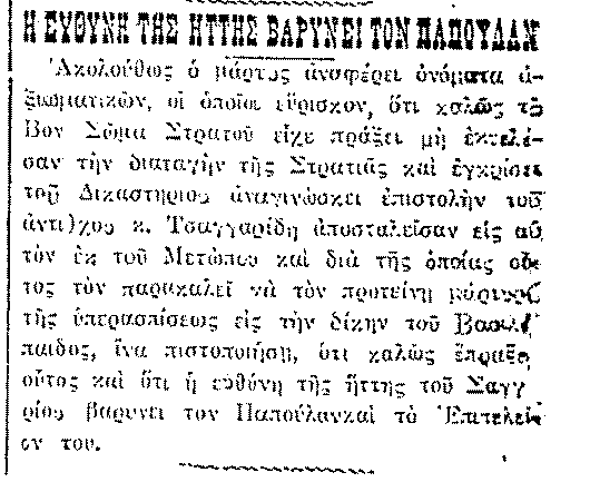Τελικώς, όπως είναι γνωστό, ο “βασιλόπαις Ανδρέας”, σε αντίθεση με τους “Έξι” καταδικάστηκε σε “ισόβιον υπερορίαν” και “έκπτωσιν του βαθμού του”. Ήταν, από δικονομικής άποψης μια πρωτοφανής ποινή, που εξηγείται από το “επαναστατικό δίκαιο” των ημερών και την έντονη βρετανική παρέμβαση για να μην επιβληθεί νέα θανατική ποινή μετά την εκτέλεση των Γούναρη και των άλλων πέντε της 15ης Νοεμβρίου. Η κατηγορία που αντιμετώπιζε ο Ανδρέας ήταν “ανυποταξία ενώπιον του εχθρού”. Βλ. την απόφαση της 19ης Νοεμβρίου 1922 (στο ίδιο φύλλο του Εμπρός)