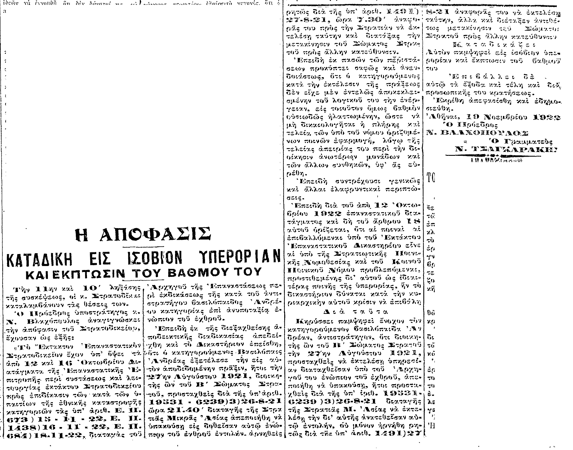 Τελικώς, όπως είναι γνωστό, ο “βασιλόπαις Ανδρέας”, σε αντίθεση με τους “Έξι” καταδικάστηκε σε “ισόβιον υπερορίαν” και “έκπτωσιν του βαθμού του”. Ήταν, από δικονομικής άποψης μια πρωτοφανής ποινή, που εξηγείται από το “επαναστατικό δίκαιο” των ημερών και την έντονη βρετανική παρέμβαση για να μην επιβληθεί νέα θανατική ποινή μετά την εκτέλεση των Γούναρη και των άλλων πέντε της 15ης Νοεμβρίου. Η κατηγορία που αντιμετώπιζε ο Ανδρέας ήταν “ανυποταξία ενώπιον του εχθρού”. Βλ. την απόφαση της 19ης Νοεμβρίου 1922 (στο ίδιο φύλλο του Εμπρός)