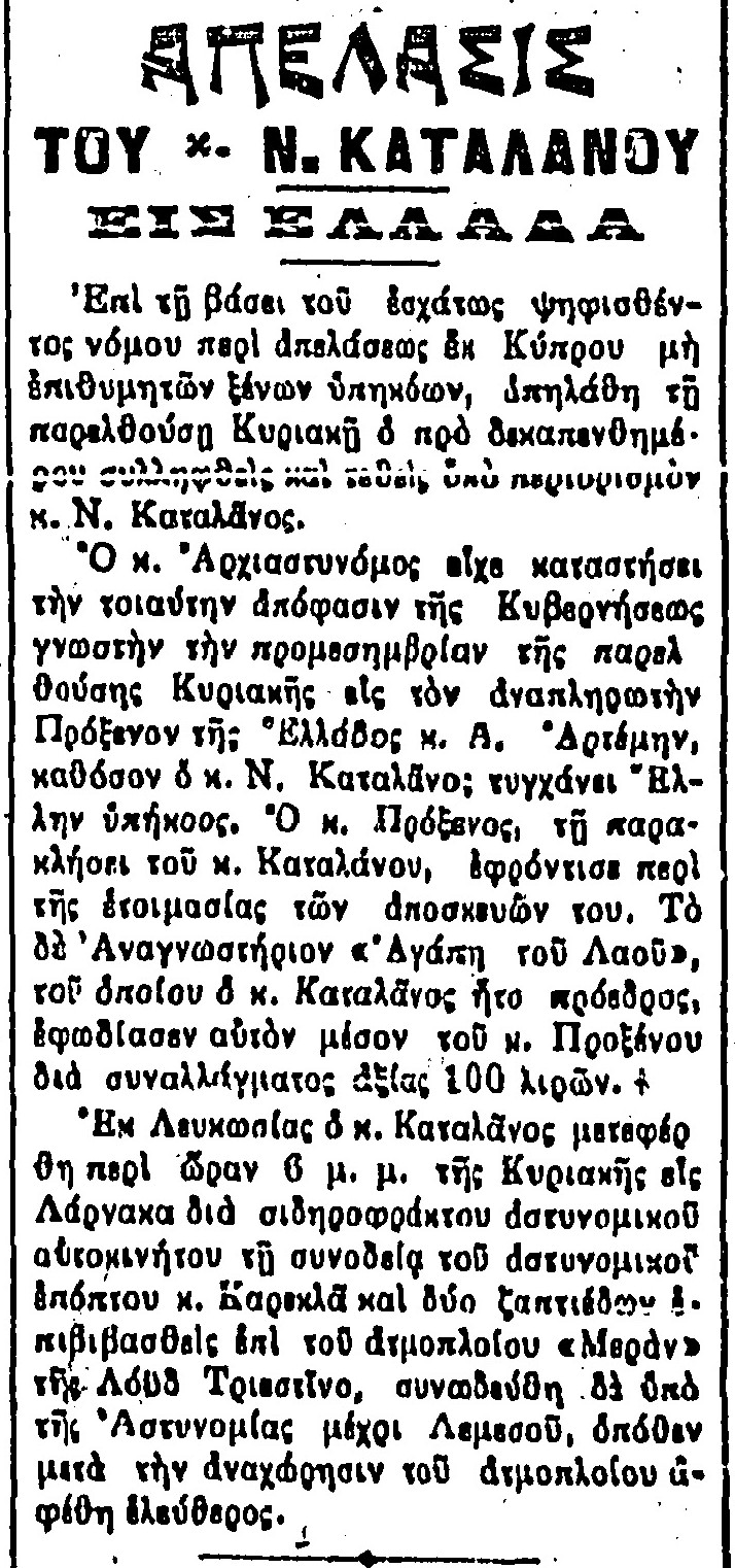 Φαίνεταί μοι αποθνήσκω μετ’ ολίγον και θέλω να δώσω μερικάς περί εμού πληροφορίας και να δηλώσω την τελευταίαν θέλησίν μου. Ονομάζομαι Ν. Καταλάνος ή Γιαννακούρας εκ Νομιτσή του Δήμου Λεύκτρων της Οιτύλου. Εις τα χαρτιά μου υπάρχει ημιτελής βιογραφία μου. Εξωρίσθην εκ Κύπρου από του 1921. Συντηρούμαι από συνδρομάς εκεί φίλων μου και παρ’ ευαγών ιδρυμάτων. Εξ οικονομιών μοι υπολείπονται καταθέσεις εις Τράπεζαν Αθηνών £48 και δραχμαί 25400, παρ’ εμοί δε εις συναλλάγματα £55 και χαρτονομίσματα αγγλικά και κυπριακά £17 και χρυσαί £5. Πάντα ταύτα ανήκουσι βεβαίως εις την Κύπρον και ουδέν δικαίωμα έχουσιν οι εξ αδιαθέτου κληρονόμοι μου. Διά ταύτα κληροδοτώ ταύτα εις το Ταμείον Συσσιτίων των απόρων παίδων Λευκωσίας Κύπρου και εκτελεστήν ορίζω τον Πανιερώτατον Μητροπολίτην Κυρηνείας κον Μακάριον και τον εν Αθήναις ιατρόν Μιχ. Κινύραν (οδος Μαυροματαίων 9) προς τους οποίους παρακαλώ την Αστυνομίαν να αποταθή διά τα περαιτέρω.