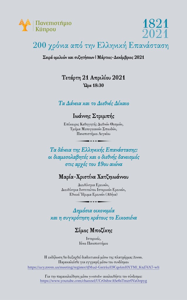 Στο ζήτημα των Δανείων, στο Διεθνές Δίκαιο και στη Δημόσια Οικονομία της επαναστατημένης Ελλάδας του 1821 είναι αφιερωμένη η όγδοη διαδικτυακή εκδήλωση του Πανεπιστημίου Κύπρου, που θα πραγματοποιηθεί την Τετάρτη, 21 Απριλίου 2021, στις 18:30, στο πλαίσιο της σειράς ομιλιών και συζητήσεων με τίτλο «1821-2021: 200 χρόνια από την Ελληνική Επανάσταση».