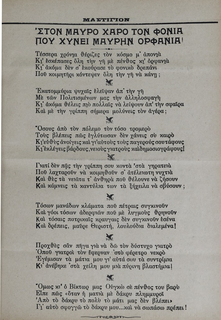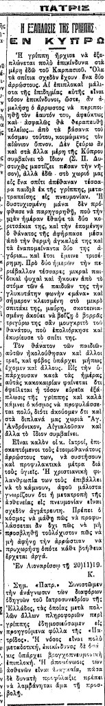 Έχοντας κλείσει περισσότερους από δώδεκα μήνες στα «χρόνια της σύγχρονης πανδημίας» και βαδίζοντας προς το δεύτερο Πάσχα υπό συνθήκες περιορισμού εξαιτίας του κορονοϊού, αναζήτησα ξανά στις πηγές της εποχής το πώς βίωσαν στην Κύπρο τη βροτολοιγό γρίππη του 1918-1919. Μια πρώτη αναφορά είχα κάνει, θυμίζω, στην περσινή ανάρτηση στο «Περί Ιστορίας» (14 Μαρτίου 2020) με τίτλο «Η ισπανική γρίππη στην Κύπρο, 1918» https://papapolyviou.com/2020/03/14/i-ispaniki-gripi-stin-kipro-1918/