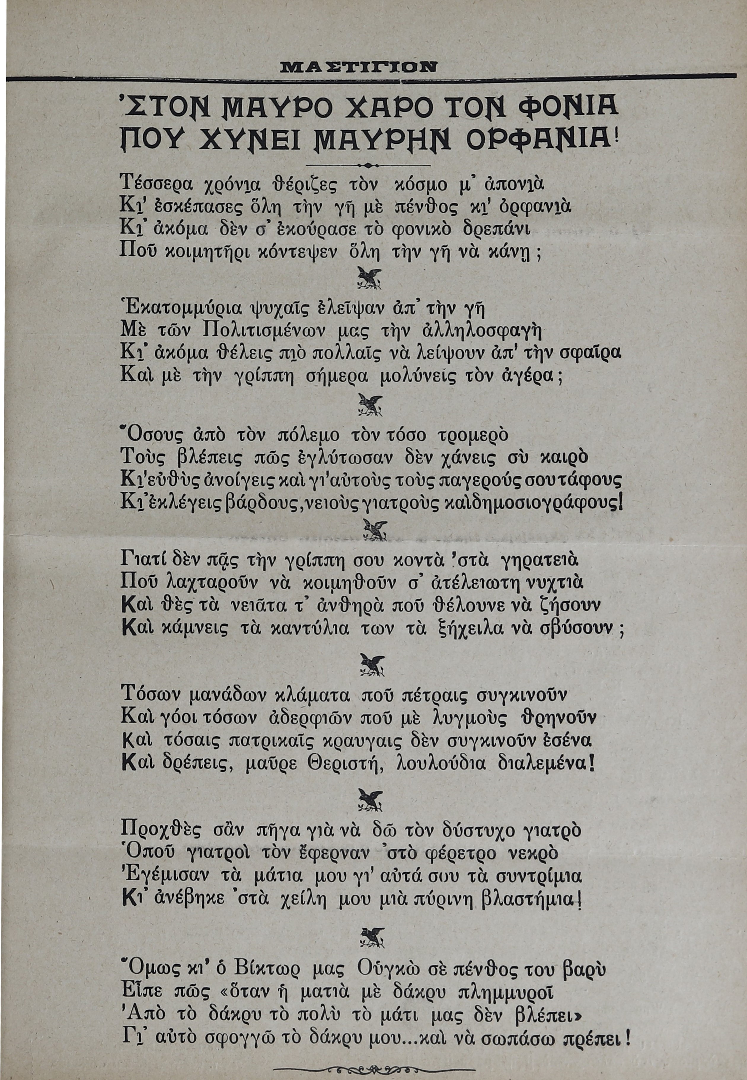 Έναν από τα θύματα της γρίππης στην κυπριακή πρωτεύουσα, τον νεαρό γιατρό Μιχαήλ Ι. Τομπάζη, που πέθανε τα Χριστούγεννα του 1918, έκλαψε στη σατιρική του εφημερίδα Μαστίγιον (φ. 3 Ιανουαρίου 1919) ο Λευκωσιάτης ποιητής Ιωάννης Περδίος. Το ποίημά του απευθύνεται «Στον μαύρο χάρο τον φονιά, που χύνει μαύρην ορφανιά» και εκφράζει την οδύνη του, καθώς αντί να πάρει ο χάρος «τη γρίππη του κοντά στα γηρατειά» σβήνει τα καντήλια των νέων ανθρώπων, μη έχοντας χορτάσει από την ανθρωποσφαγή του Μεγάλου πολέμου που προηγήθηκε.