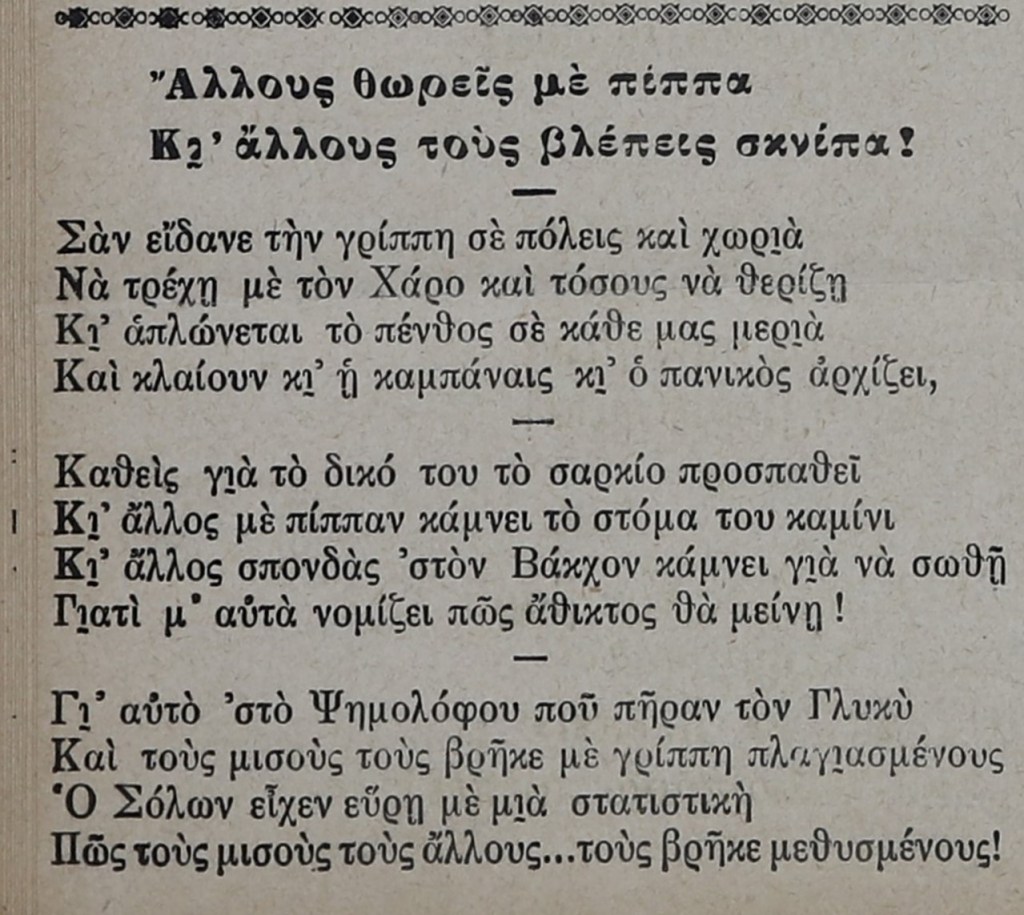 Στο ίδιο φύλλο, σε ένα μικρότερο ποίημα («Άλλους θωρείς με πίππα, Κι άλλους τους βλέπεις σκνίπα!») ο Περδίος σατιρίζει τα γιατροσόφια που επιστρατεύονταν από τους ευφάνταστους Κυπρίους για να αντιμετωπίσουν τη γρίππη. Άλλοι κάπνιζαν πίπα (!) για να αμυνθούν με τον καπνό, και άλλοι, πιο ευτυχείς και φιλοσοφούντες, το έριχναν στο ποτό… Όπως γράφει ο Περδίος, υπερβάλλοντας γουστόζικα προφανώς, σε μια επίσκεψη του γιατρού Ευέλθοντος Γλυκύ στο Ψημολόφου, οι μισοί κάτοικοι βρέθηκαν με γρίππη και οι άλλοι μισοί …μεθυσμένοι! «Ψεκασμένους», πάντως, είχε πολύ λιγότερους το 1918-1919…